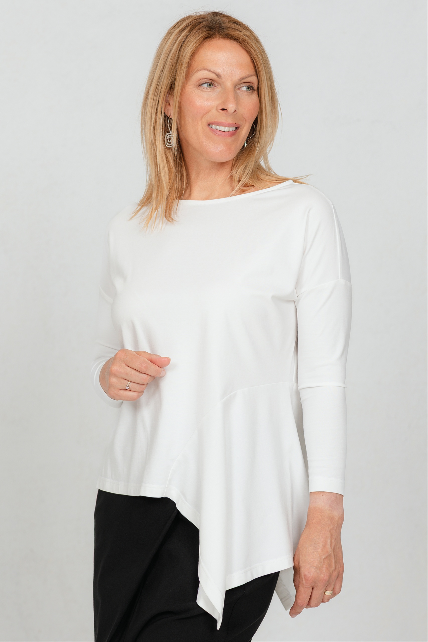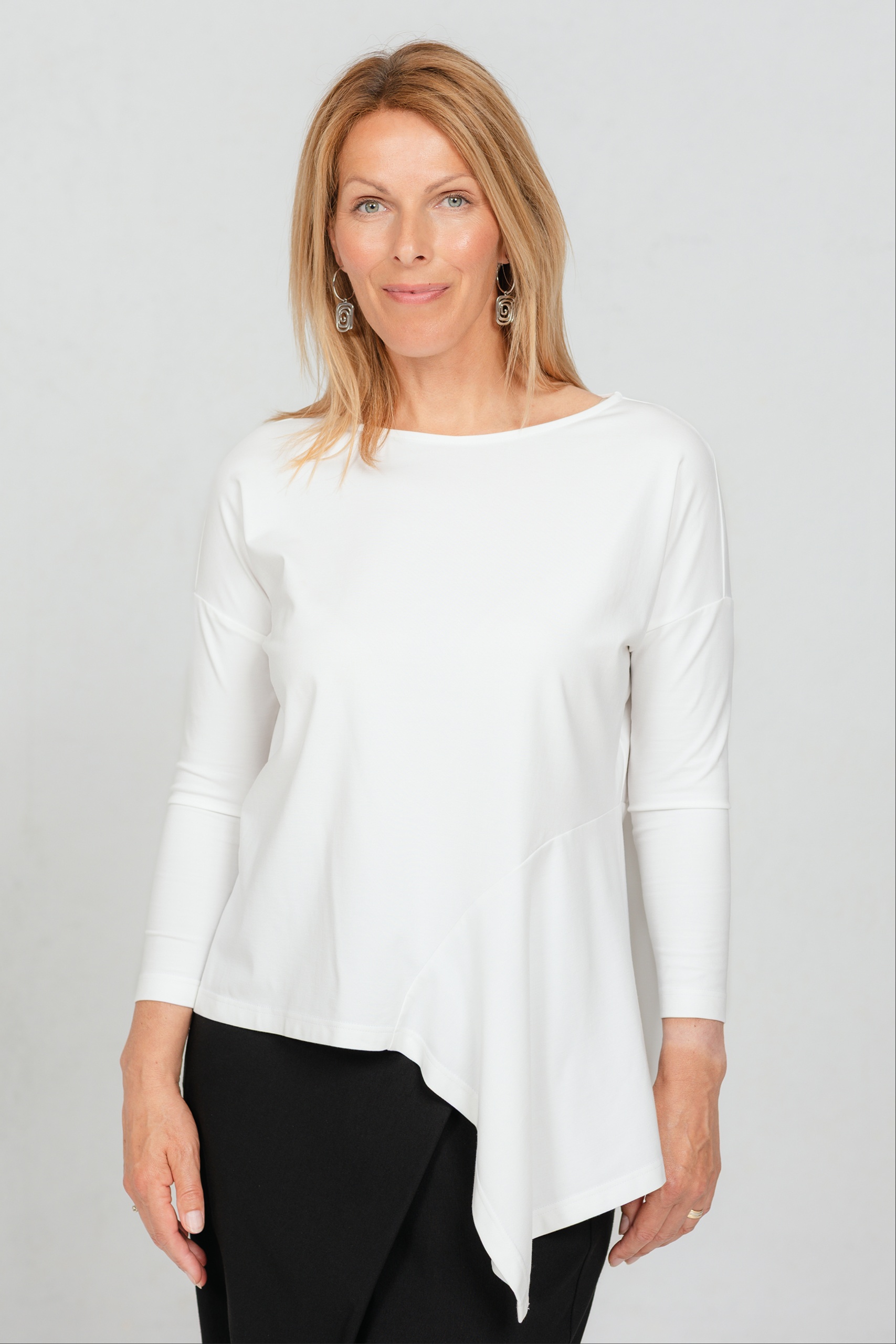 Epäsymmetrinen röyhelöpusero Dozo, valkoinen