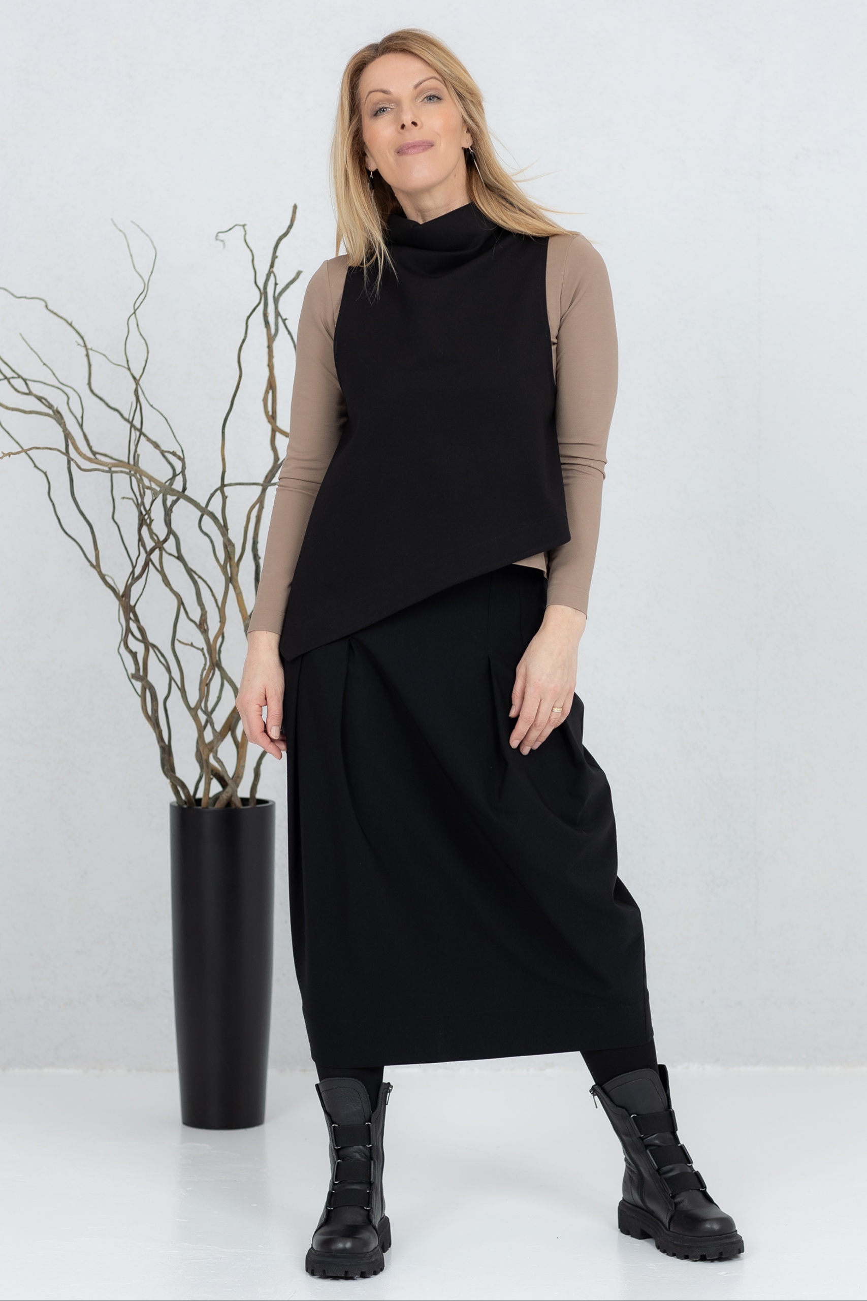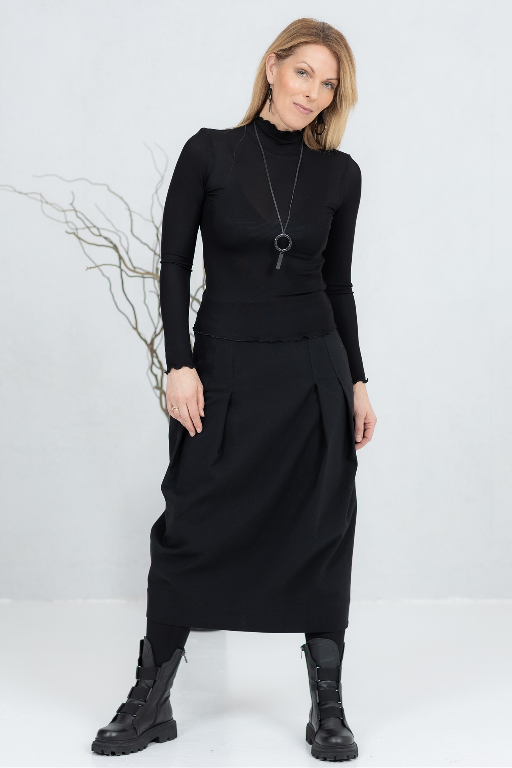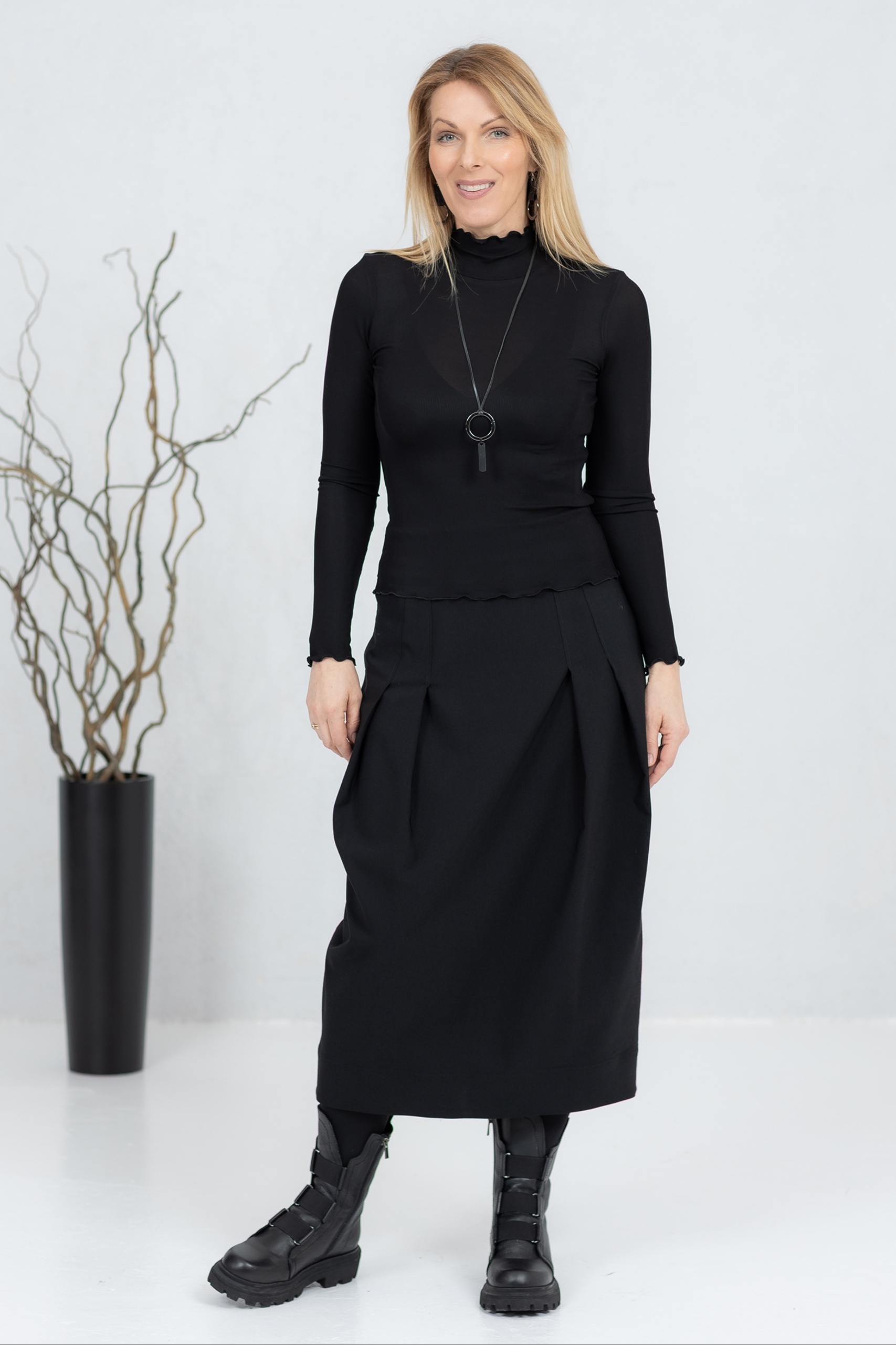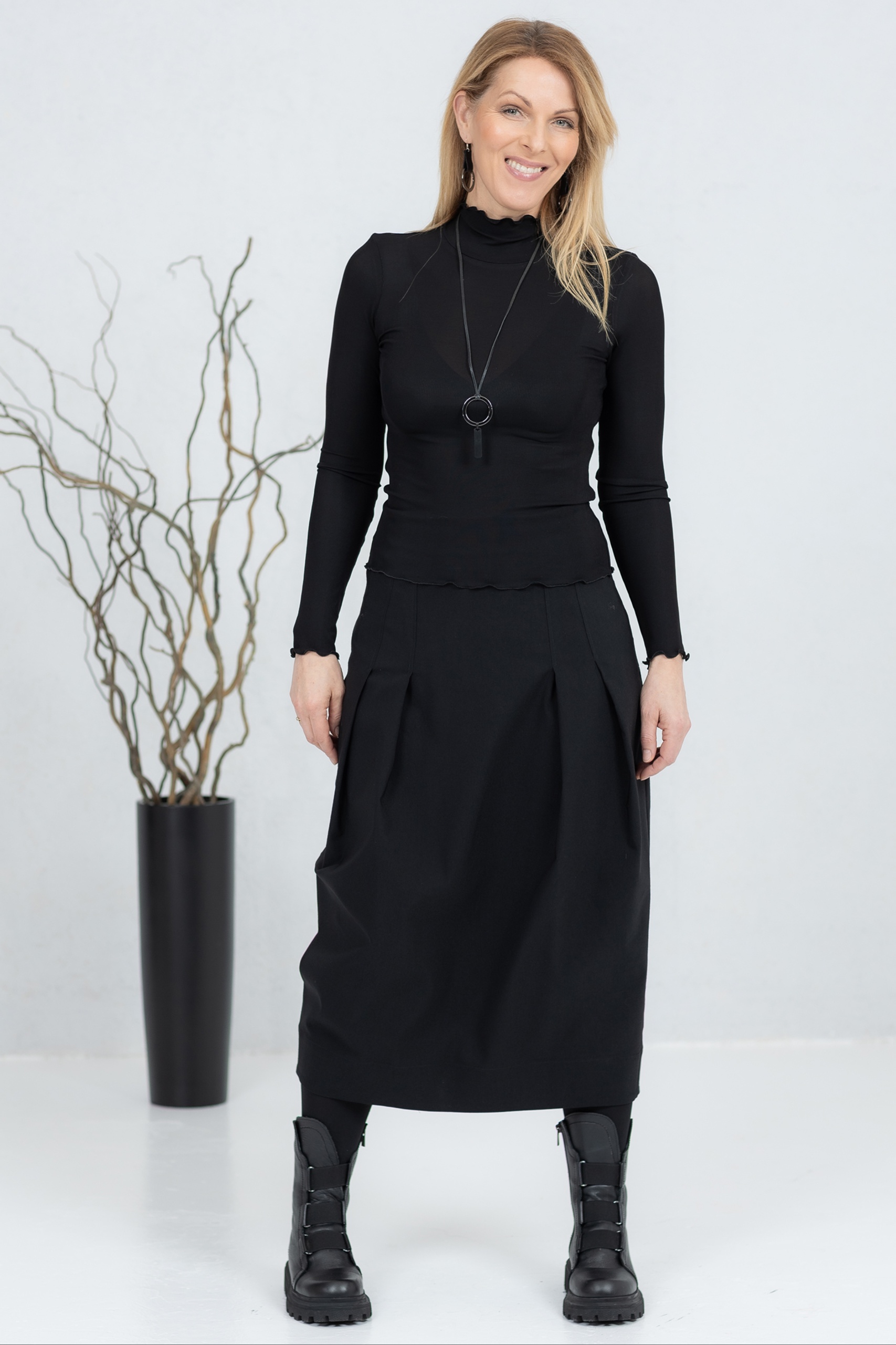 Musta midihame on moderni ja mukava valinta, jossa yhdistyvät yksinkertaisuus ja tyyli. Edessä ja takana olevat laskokset luovat kauniin tulppaanimaisen siluetin, joka laskeutuu elegantisti ja liikkuu käyttäjän mukana. Piilovetoketju antaa hameelle siistin ja tyylikkään ilmeen ja takaa mukavan istuvuuden. Kevyt mutta kestävä kangas sopii töihin, vapaa-aikaan ja muodollisempiin tilaisuuksiin. Helppo yhdistää erilaisiin yläosiin ja takkeihin – aina tyylikäs ja ajaton valinta.