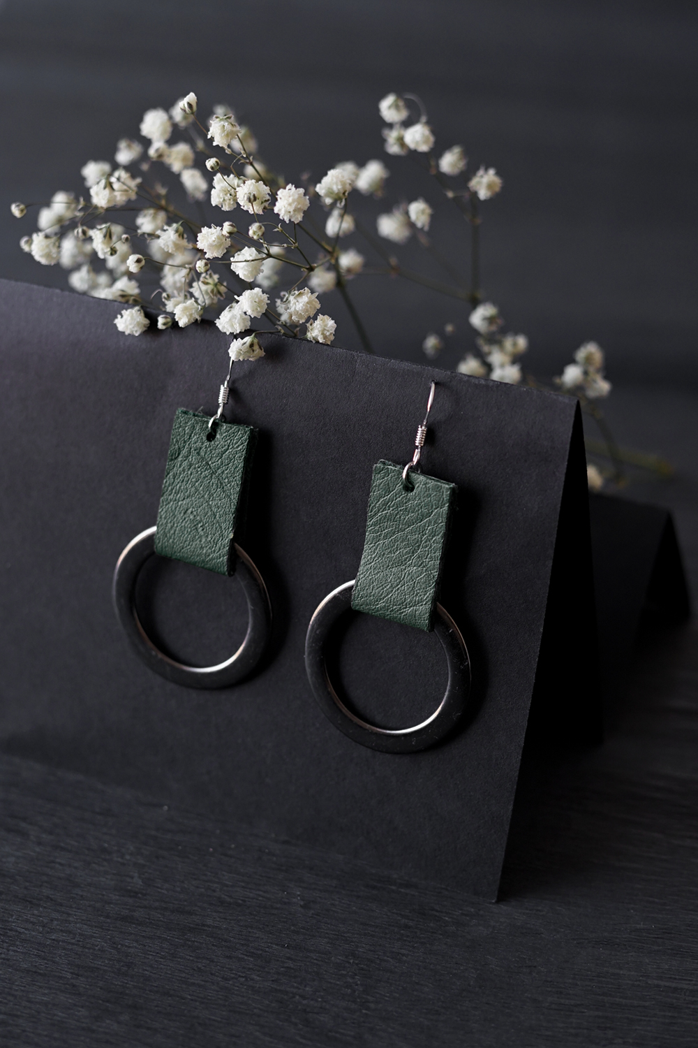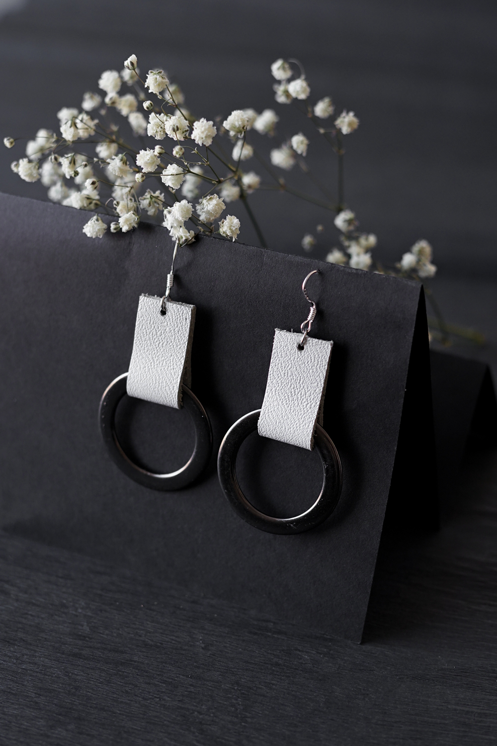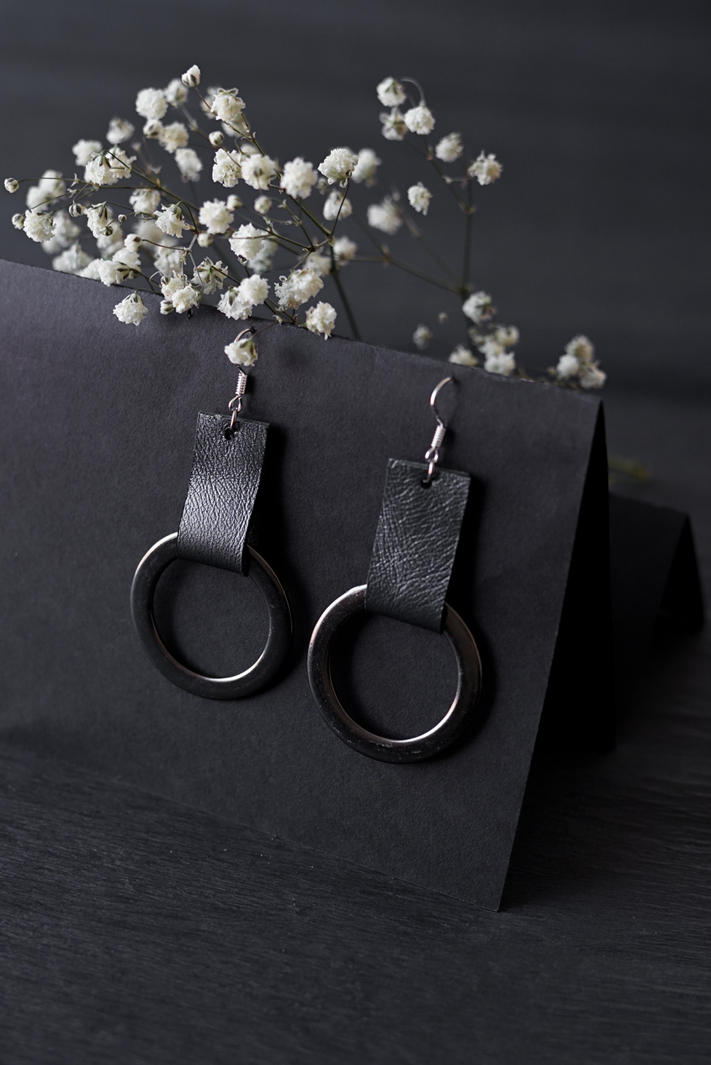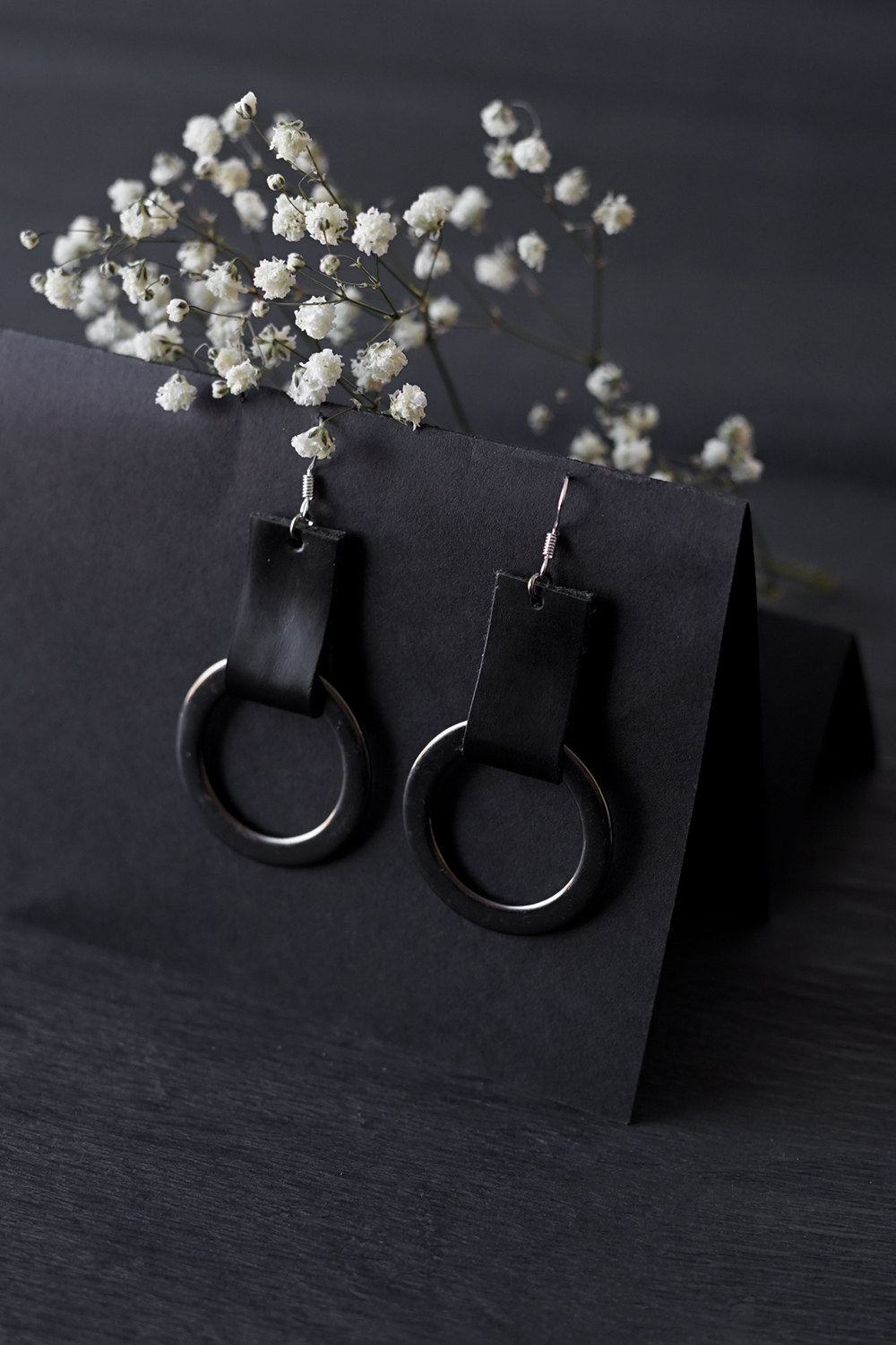 Käsityönä valmistetut korvakorut, jotka mestarikäsityöläinen Kaja Kerson on luonut erityisesti JustMustaa varten. Kierrätetyn nahan ja epätavallisten uusien materiaalien symbioosi.