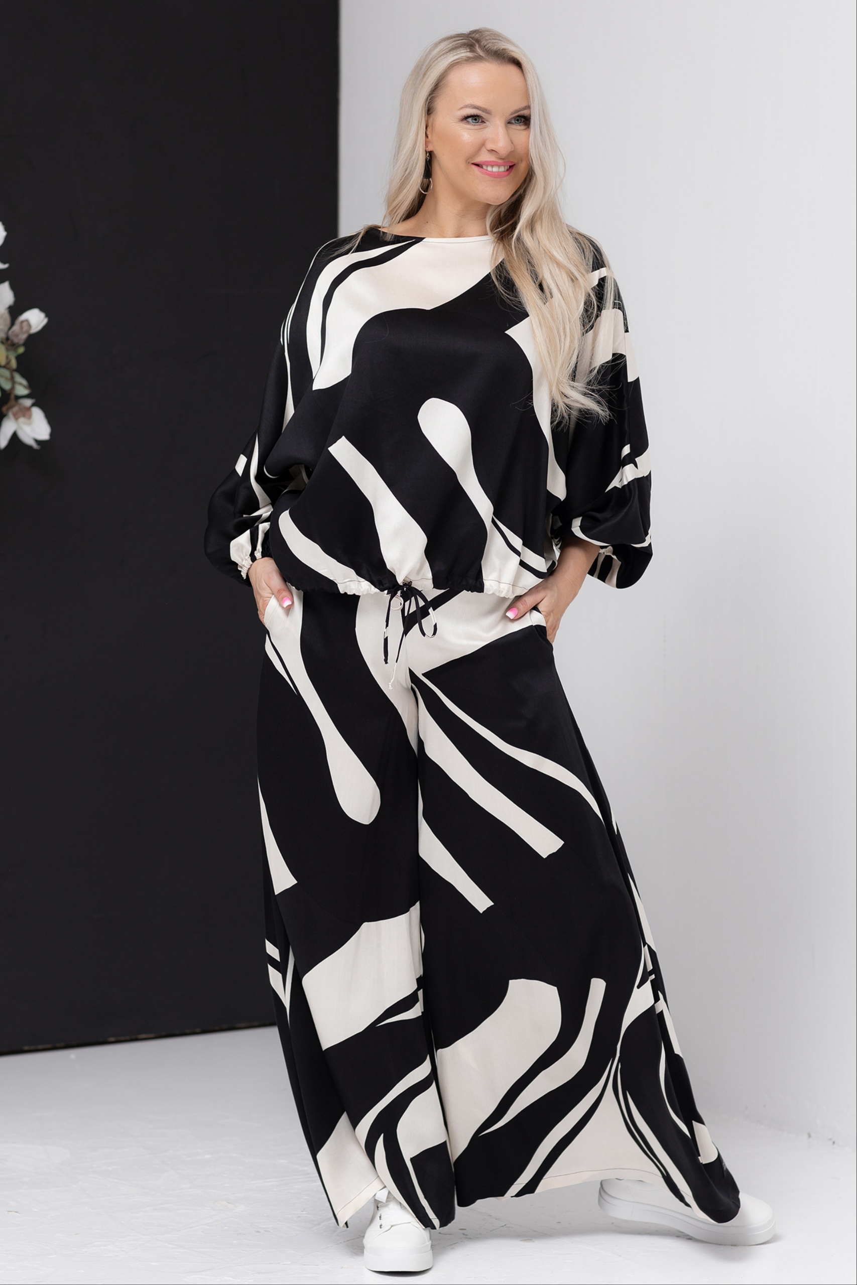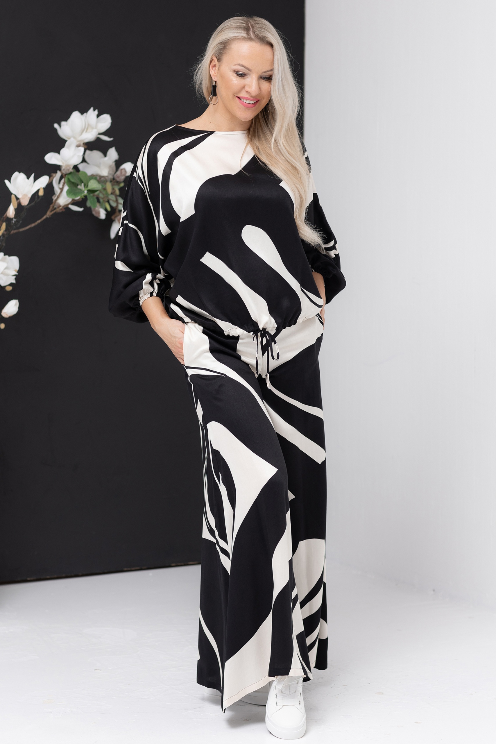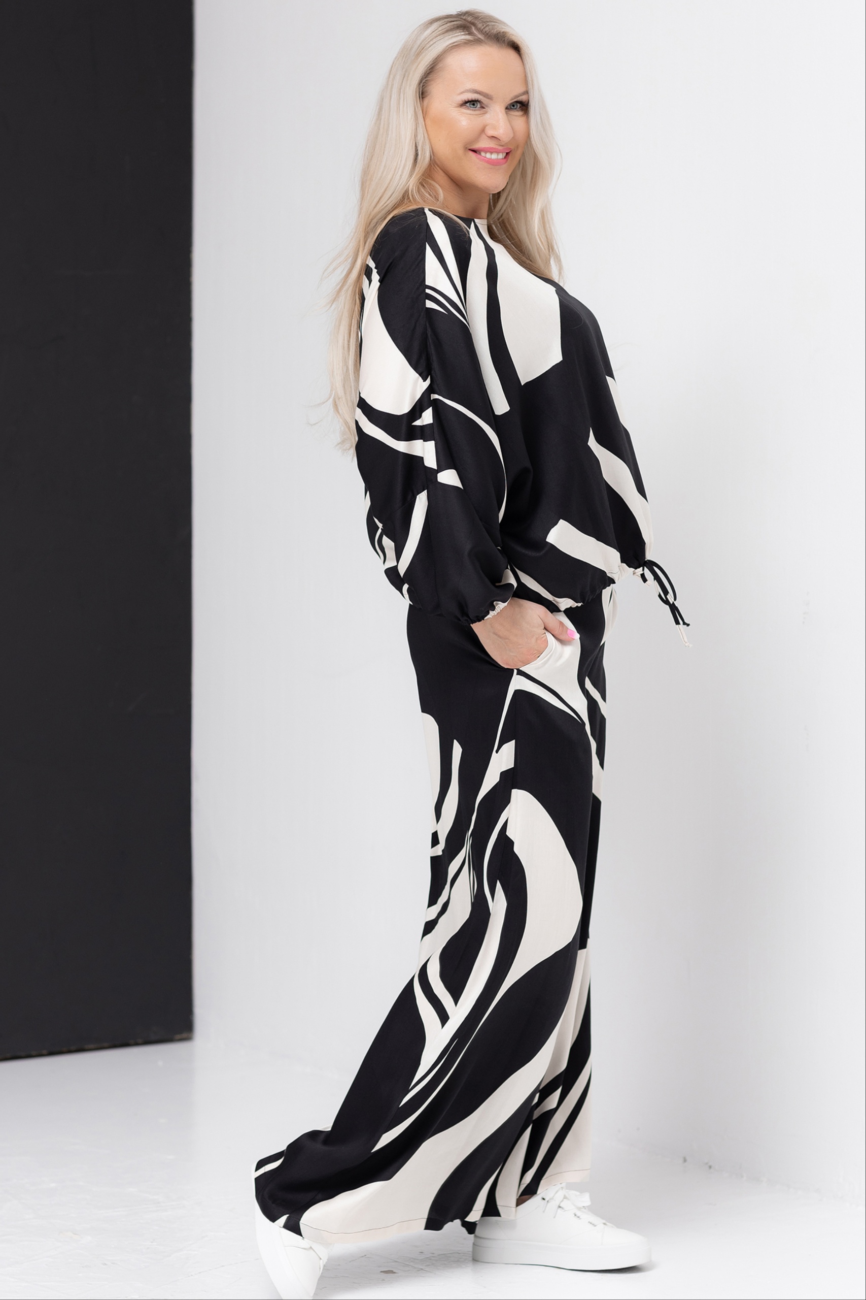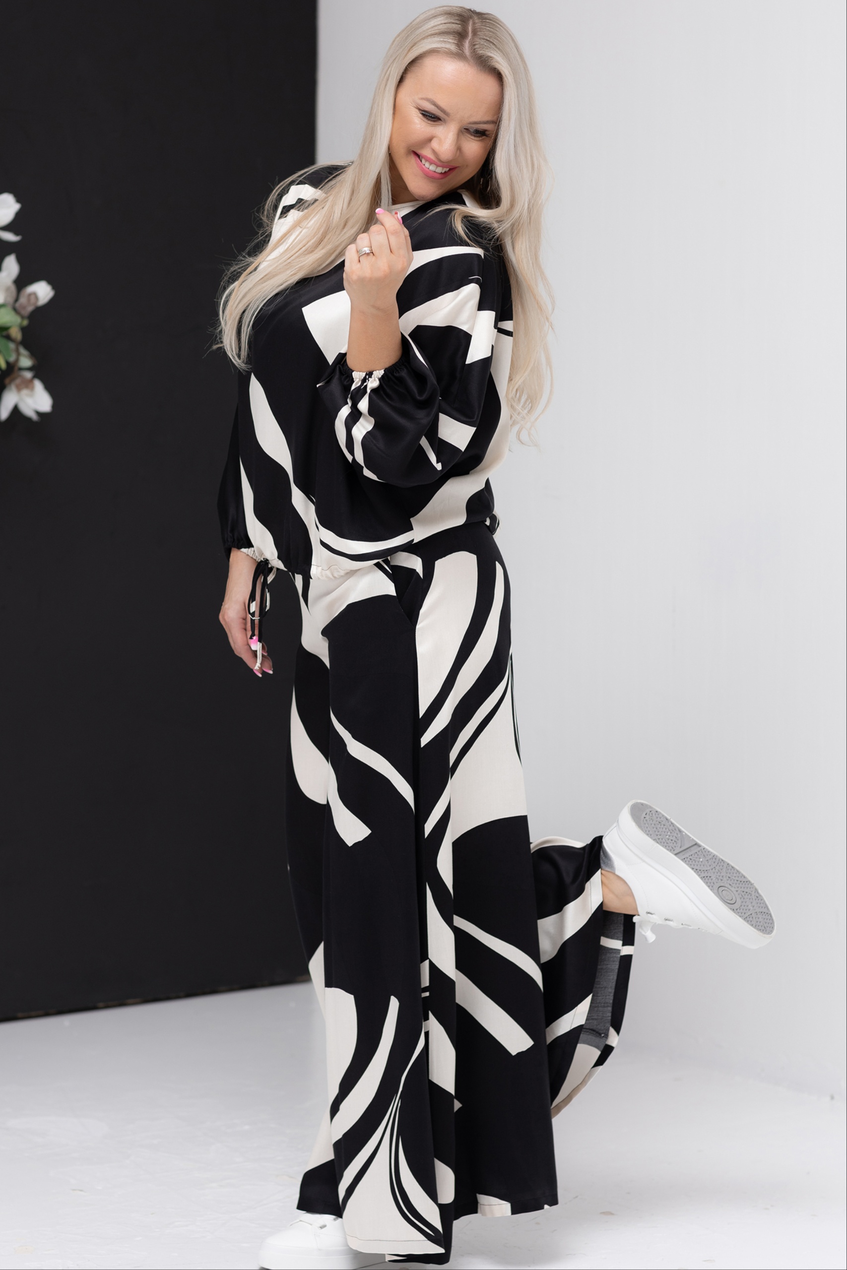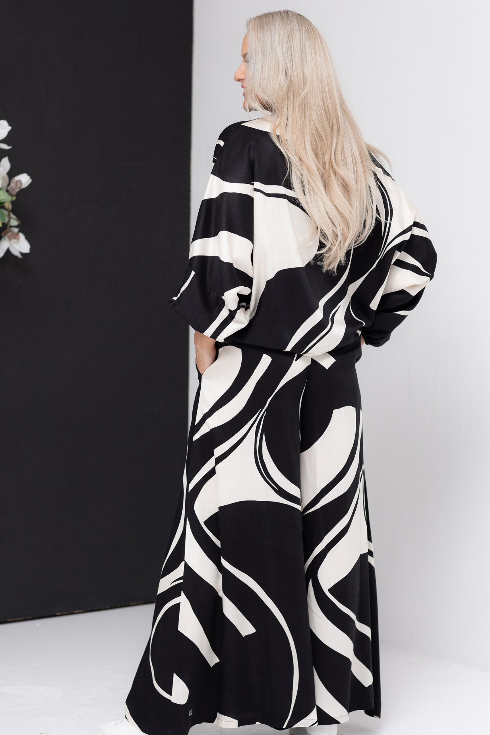 Leveät housut tyylikkäällä geometrisella kuviolla, jotka on suunniteltu yhdistämään mukavuus ja tyyli. Nämä housut eivät ole vain vaatekappale, vaan puettava taideteos, joka lisää eleganssia jokaiseen askeleeseen. Vaatetus, joka herättää huomiota ja ilmaisee itseluottamusta. Laadukas viskoosikangas, joka tuntuu silkinpehmeältä iholla, laskeutuu kauniisti vartalon mukaan ja liikkuu sulavasti ja vapaasti mukana. Housuissa on leveä joustava vyötärönauha, joka sopii täydellisesti eri vartalotyypeille.