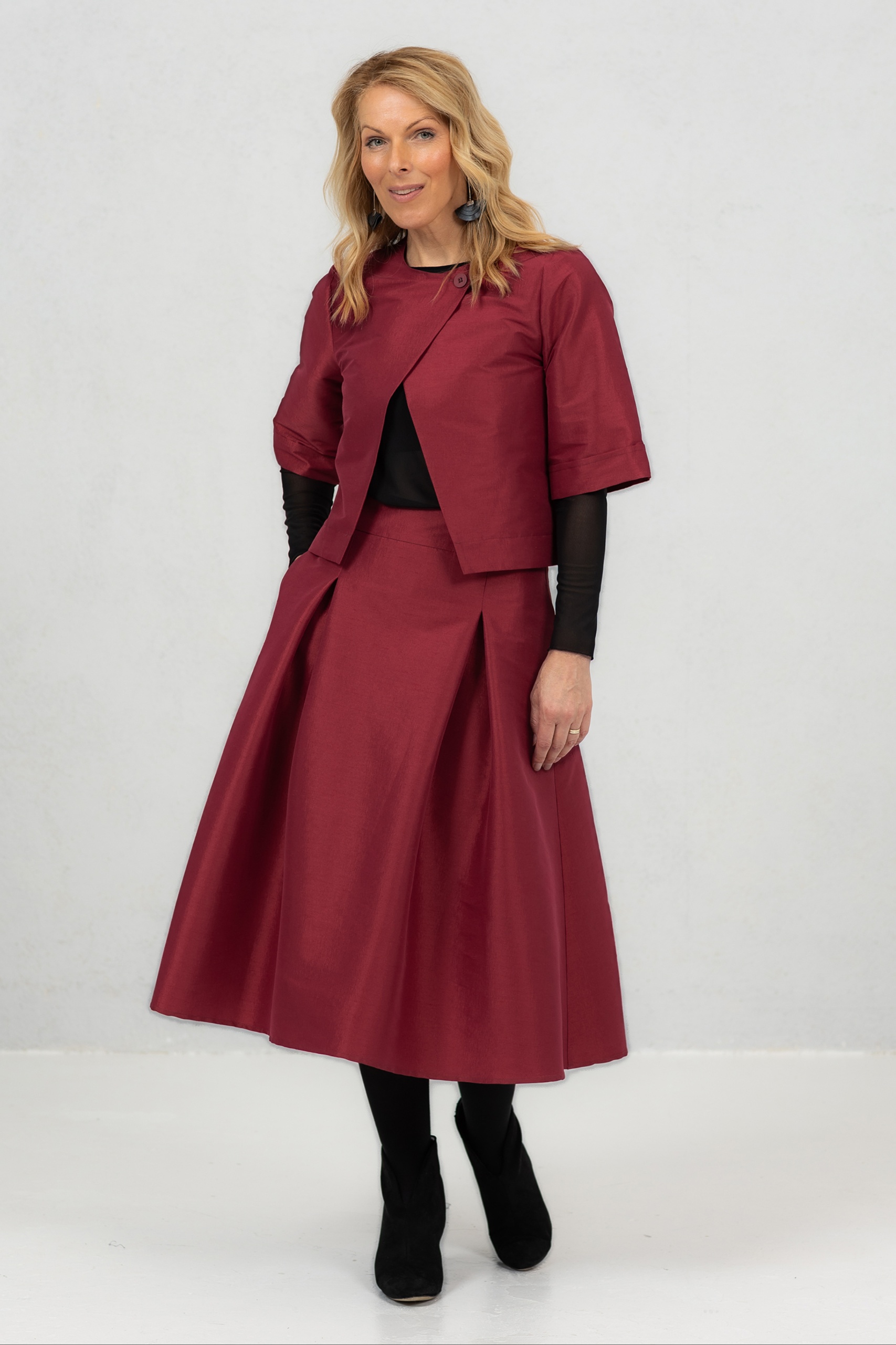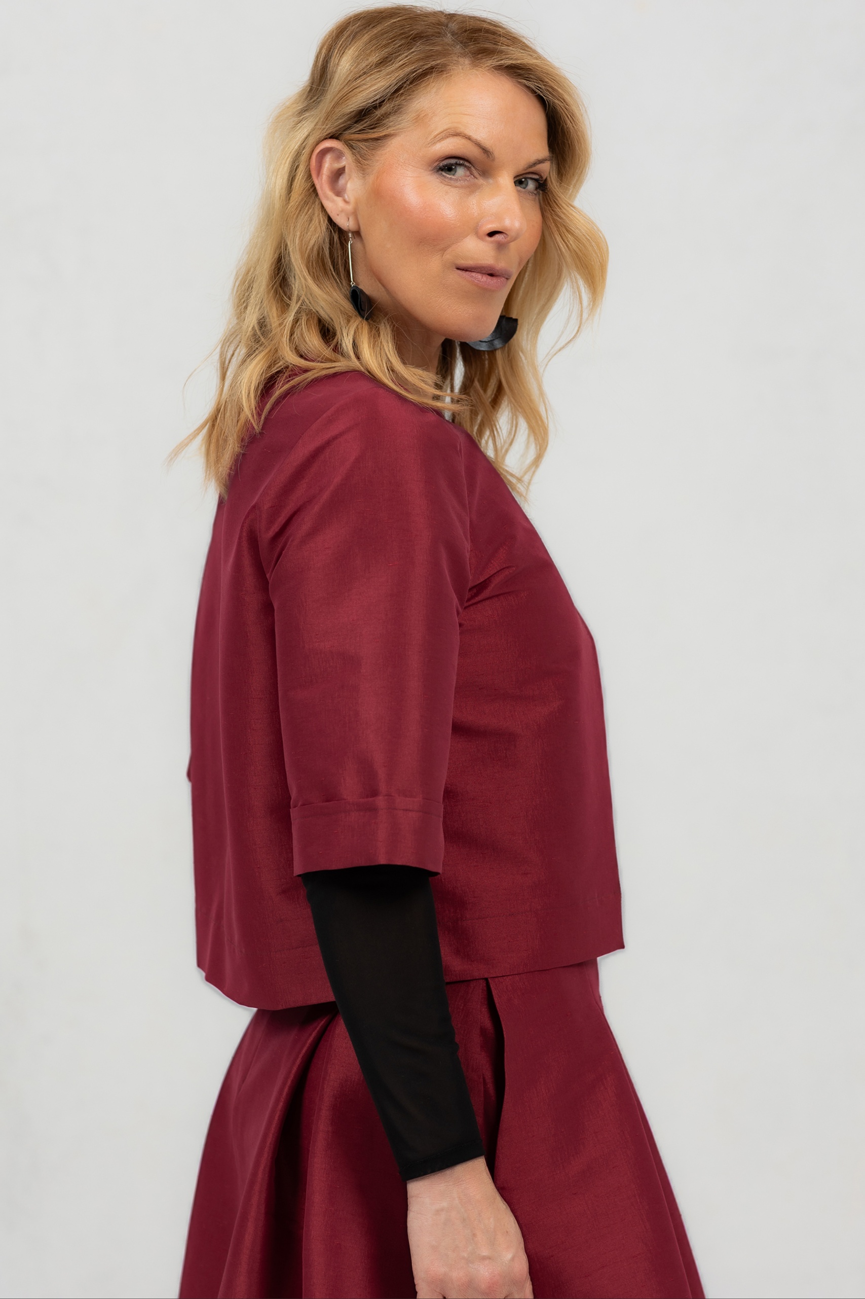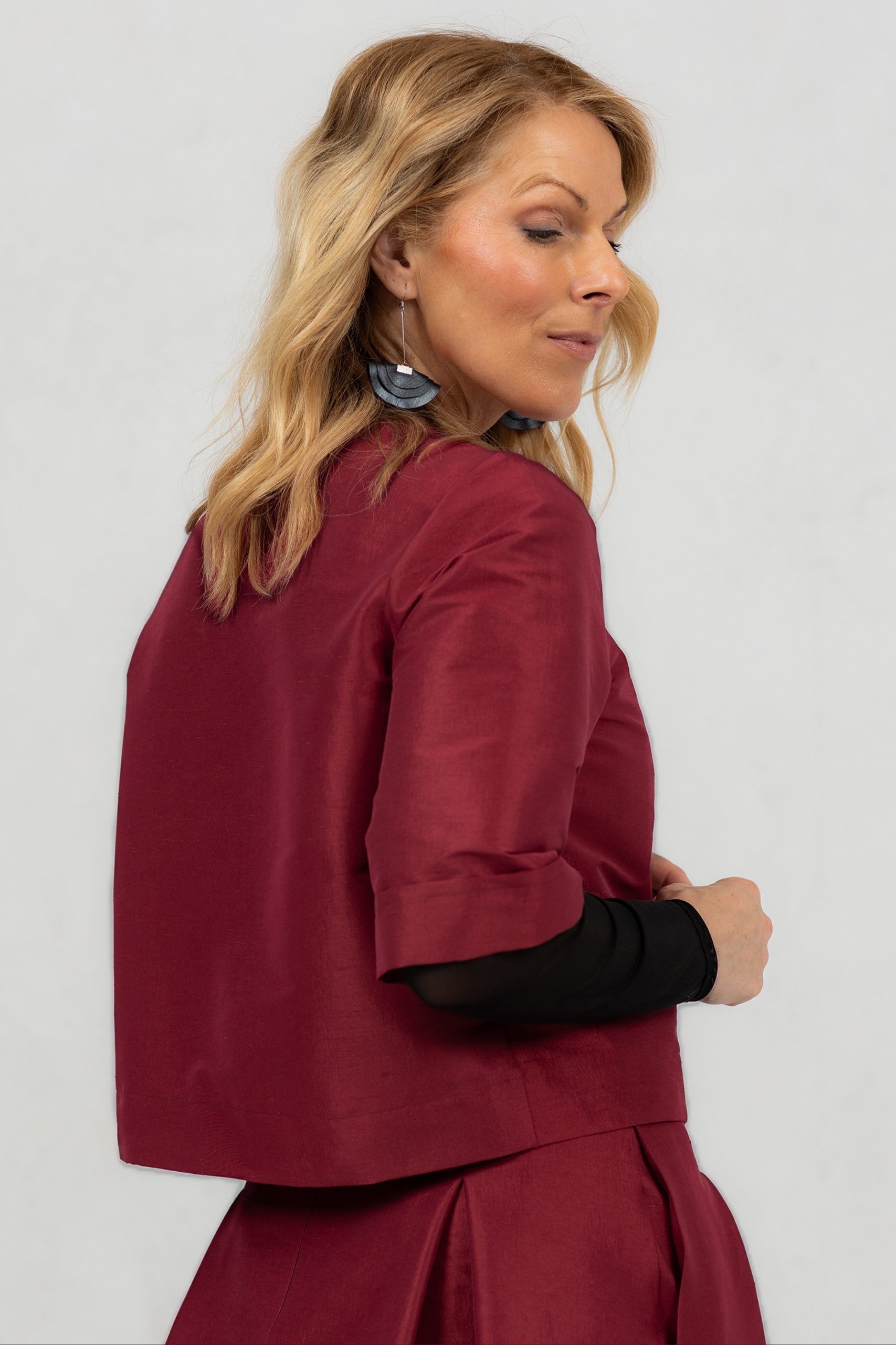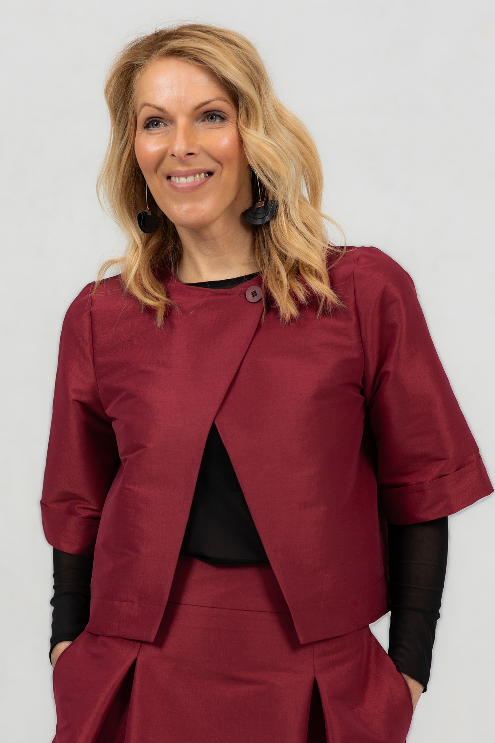 Tämä pieni taftitakki on suunniteltu hetkiä varten, jolloin haluat lisätä tyylikkään hienostuneisuuden ripauksen ulkoasuun. Minimalistinen mutta silmiinpistävä leikkaus luo selkeän linjan ja sopii yhtä hyvin hameisiin, mekkoihin ja housuihin. Kangas on hieman kiiltävä ja pitää muotonsa, mikä korostaa sen tyylikästä rakennetta. Epäsymmetrinen kiinnitys lisää designiin ainutlaatuisen vivahteen. Ihanteellinen valinta, jos haluat loistaa tyylikkäästi ja vaivattomasti.