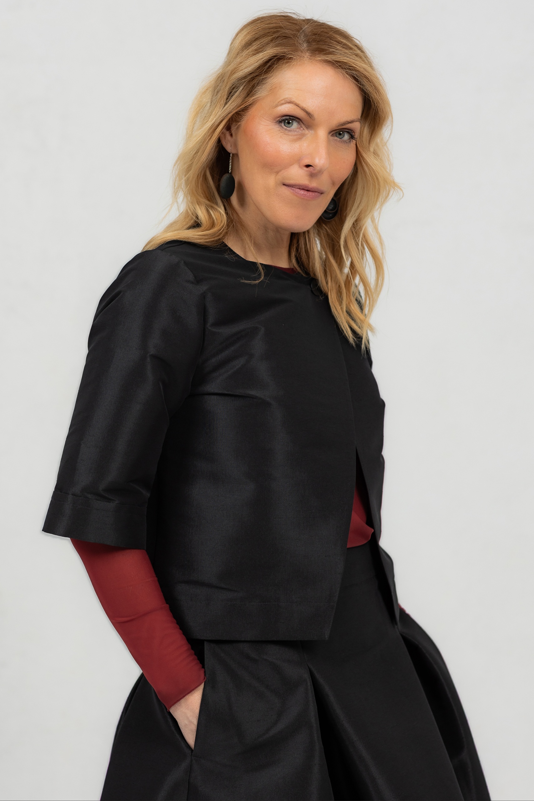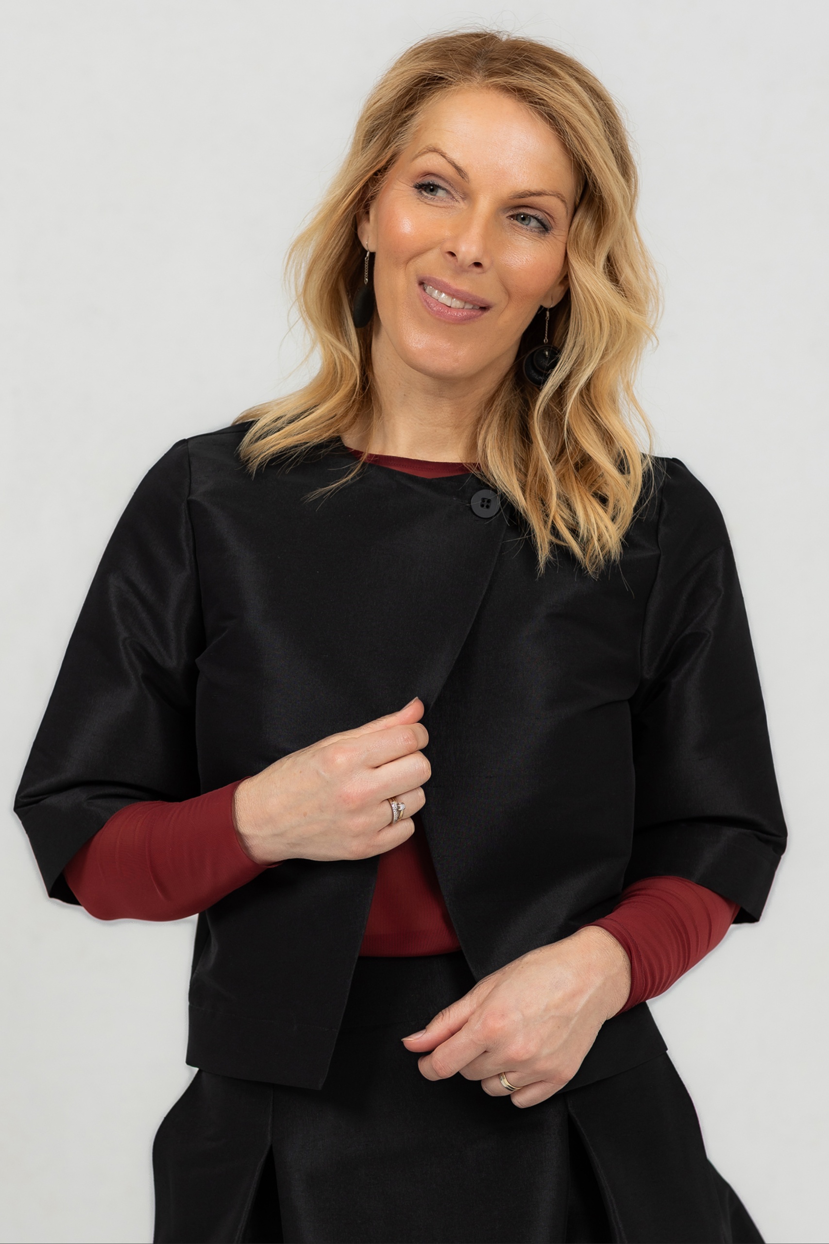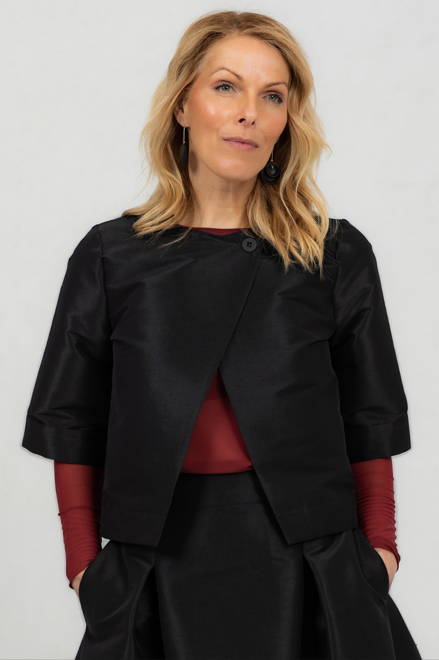 Tämä pieni taftitakki on suunniteltu hetkiä varten, jolloin haluat lisätä tyylikkään muodollisuuden ripauksen lookiisi. Minimalistinen mutta silti silmiinpistävä leikkaus luo puhtaan linjan ja sopii yhtä hyvin hameiden, mekkojen kuin housujenkin kanssa. Kangas on hieman kiiltävä ja pitää muotonsa, mikä korostaa sen tyylikästä rakennetta. Epäsymmetrinen kiinnitys lisää designiin ainutlaatuisen vivahteen. Täydellinen valinta, kun haluat loistaa tyylikkäästi ja vaivattomasti.