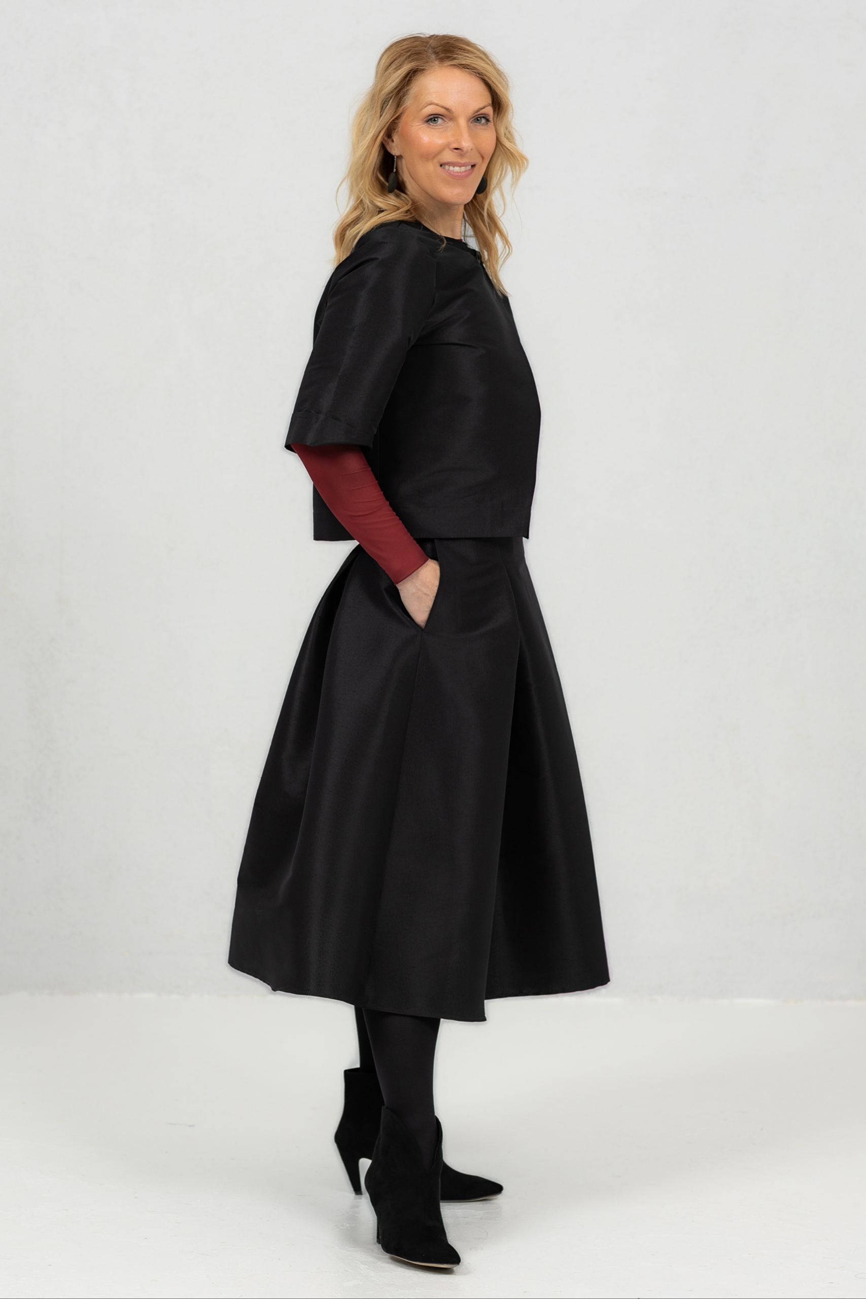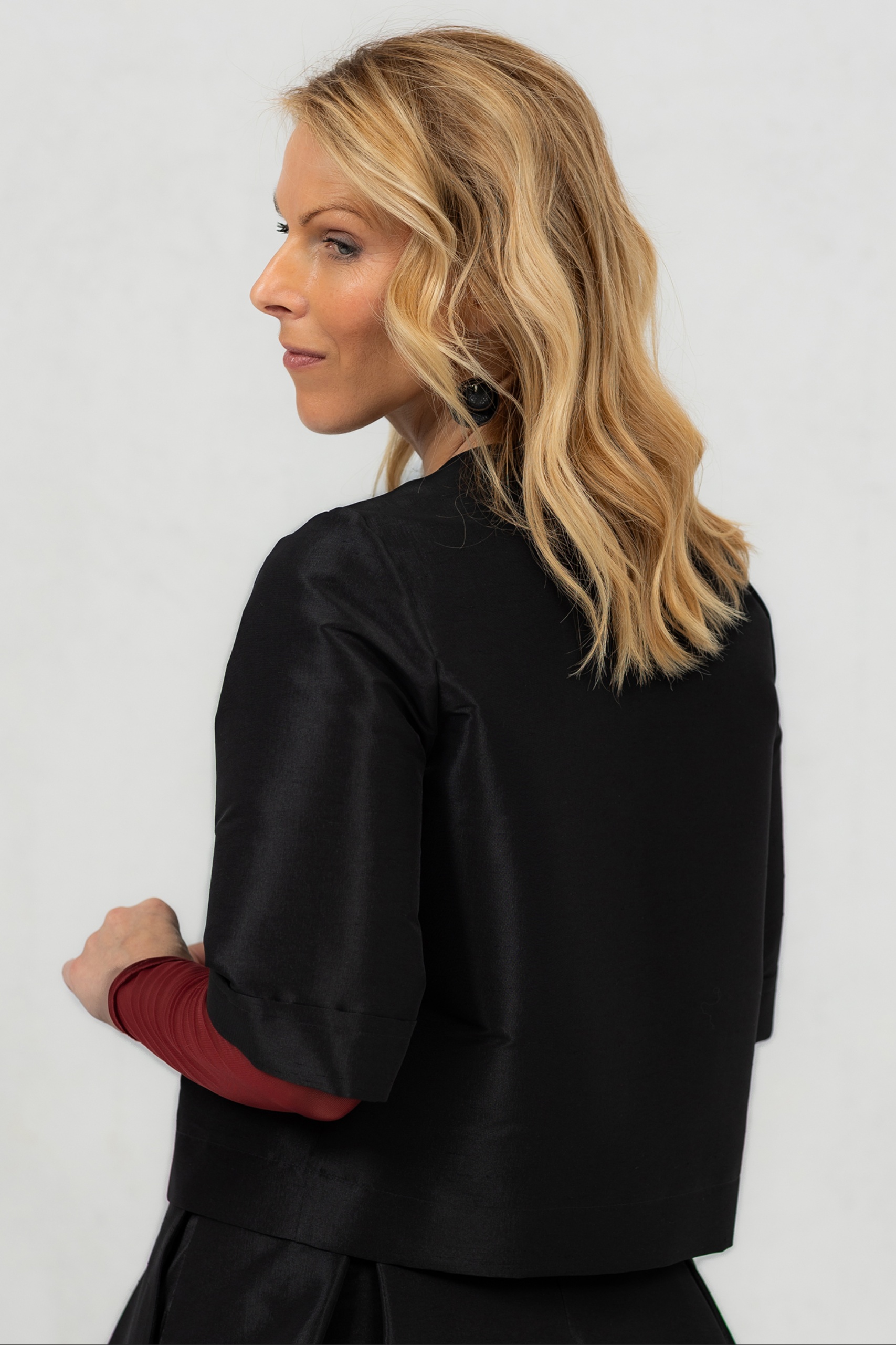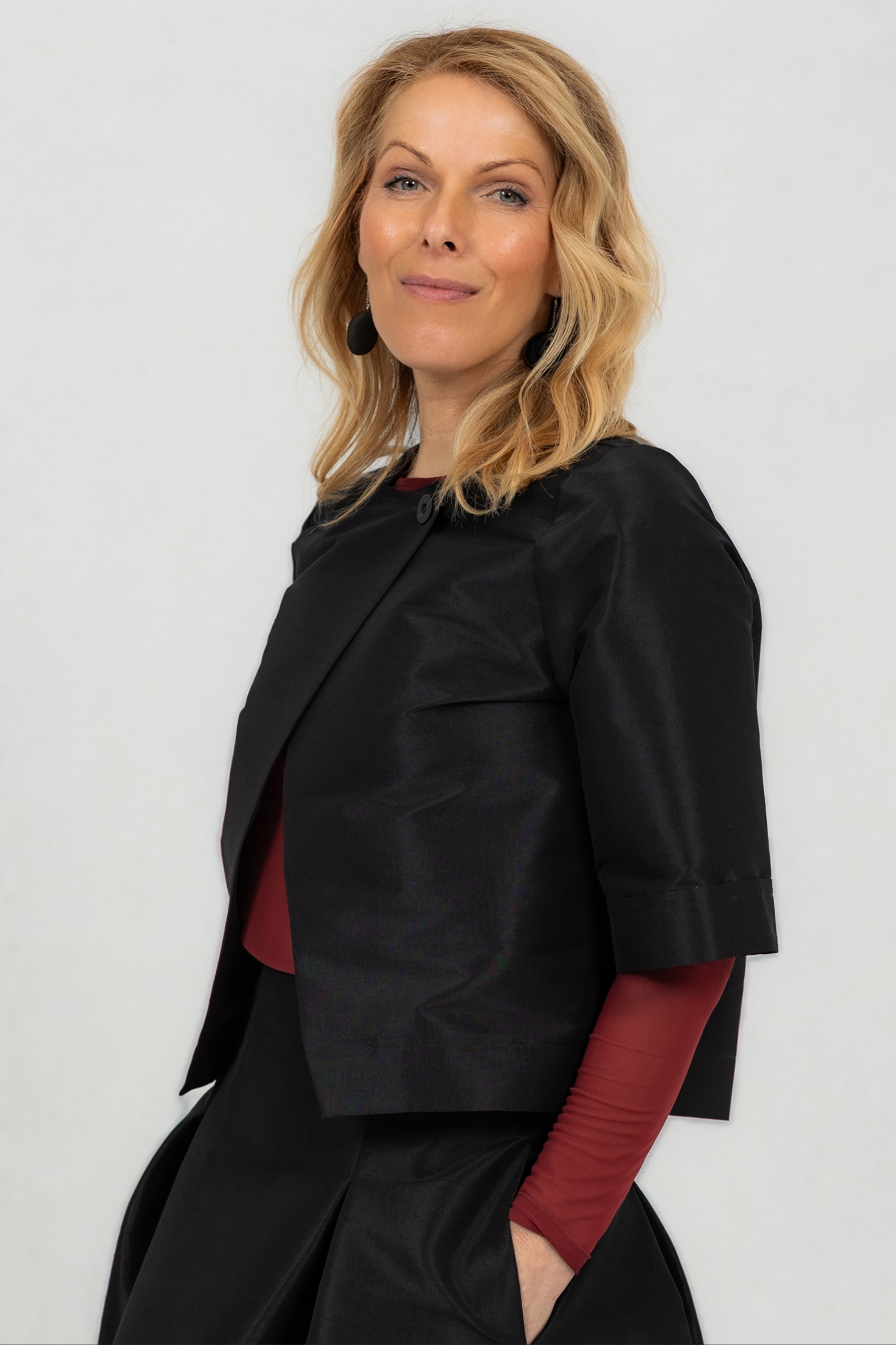 Tämä pieni taftitakki on suunniteltu hetkiä varten, jolloin haluat lisätä tyylikkään muodollisuuden ripauksen lookiisi. Minimalistinen mutta silti silmiinpistävä leikkaus luo puhtaan linjan ja sopii yhtä hyvin hameiden, mekkojen kuin housujenkin kanssa. Kangas on hieman kiiltävä ja pitää muotonsa, mikä korostaa sen tyylikästä rakennetta. Epäsymmetrinen kiinnitys lisää designiin ainutlaatuisen vivahteen. Täydellinen valinta, kun haluat loistaa tyylikkäästi ja vaivattomasti.