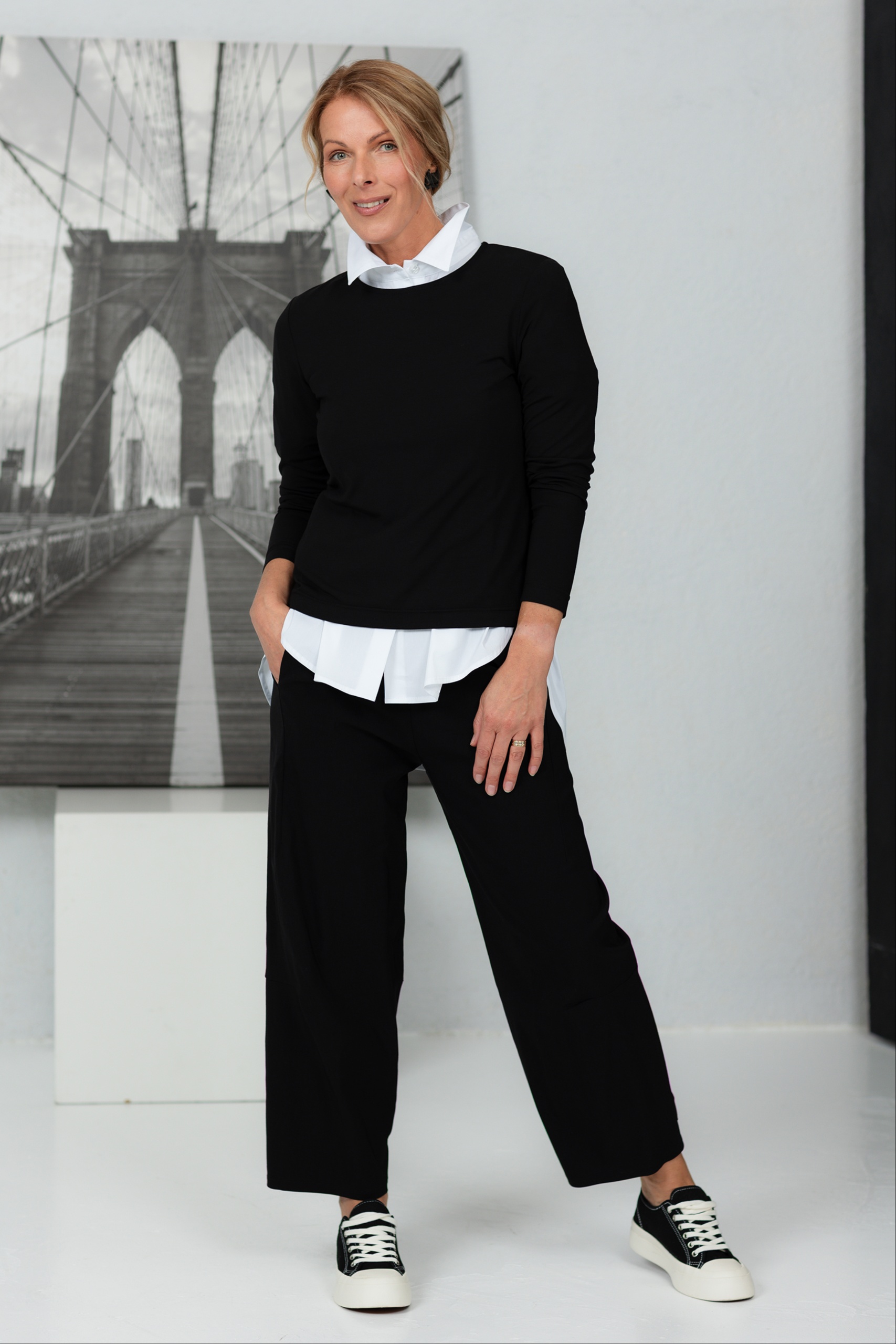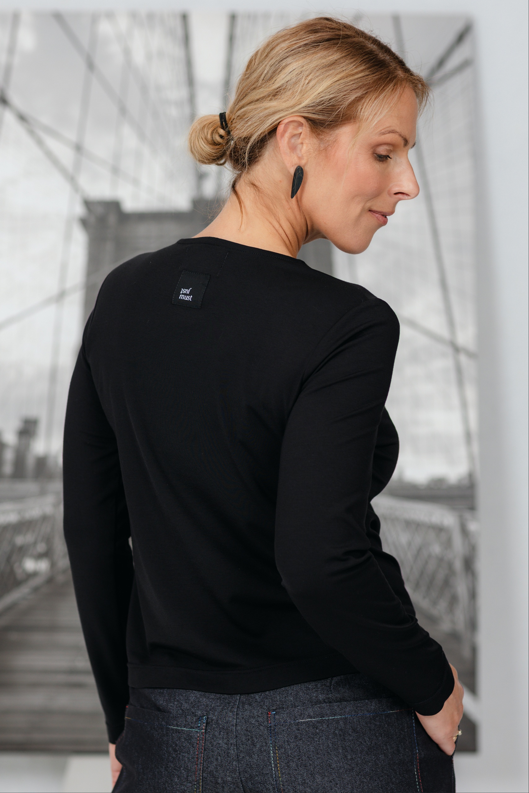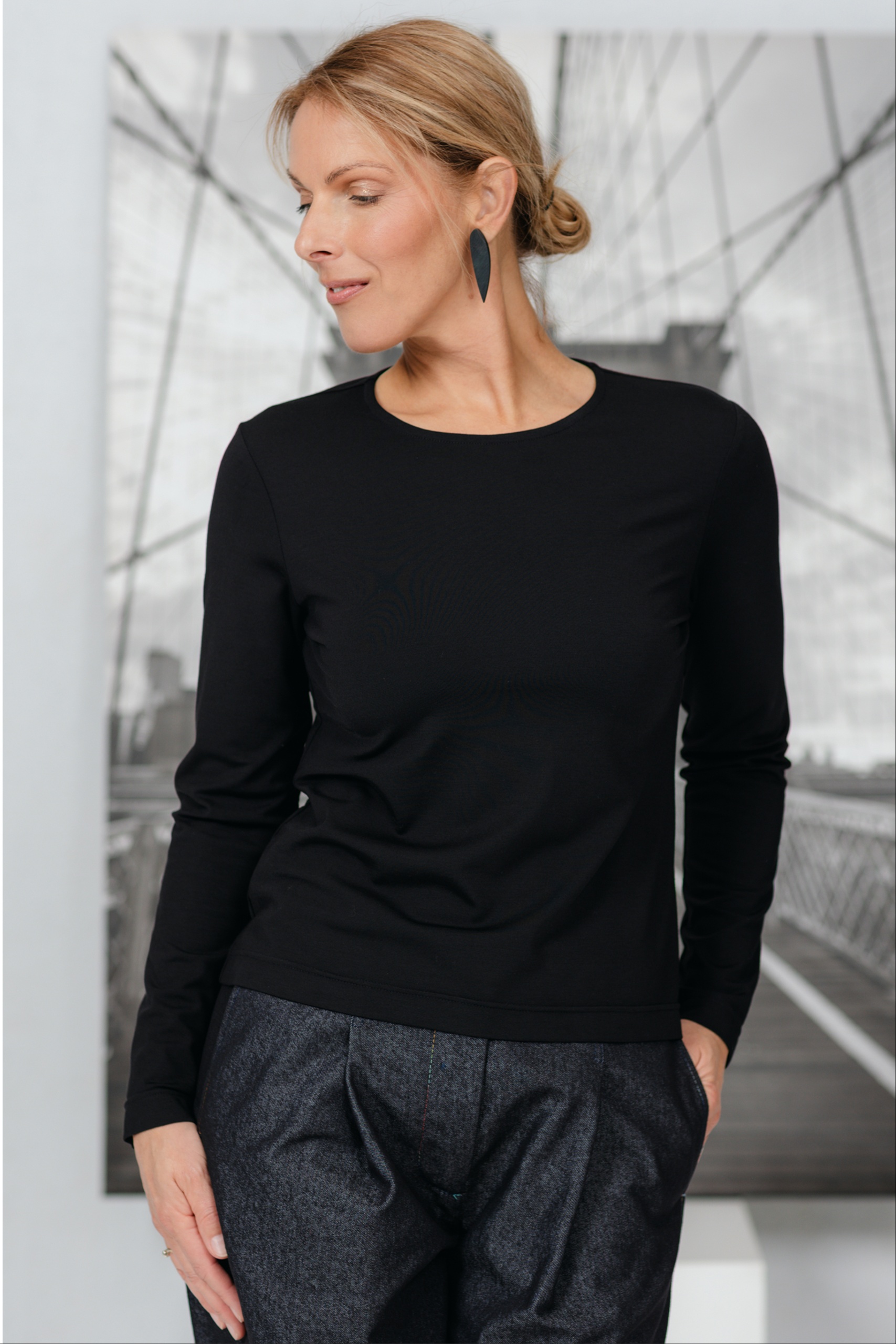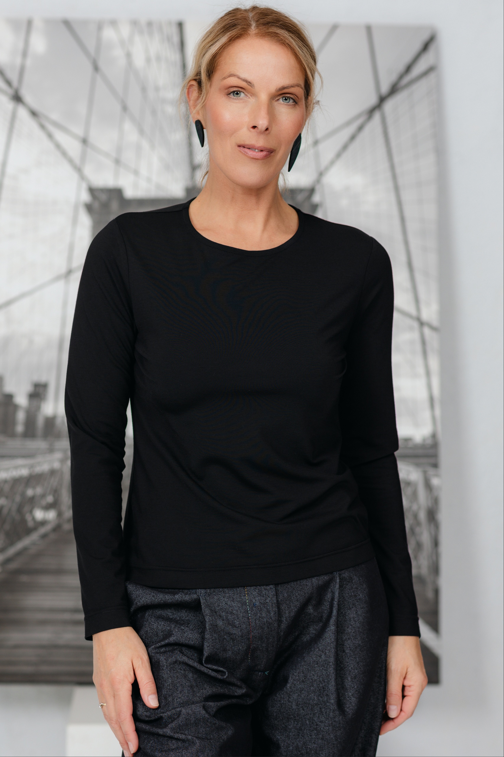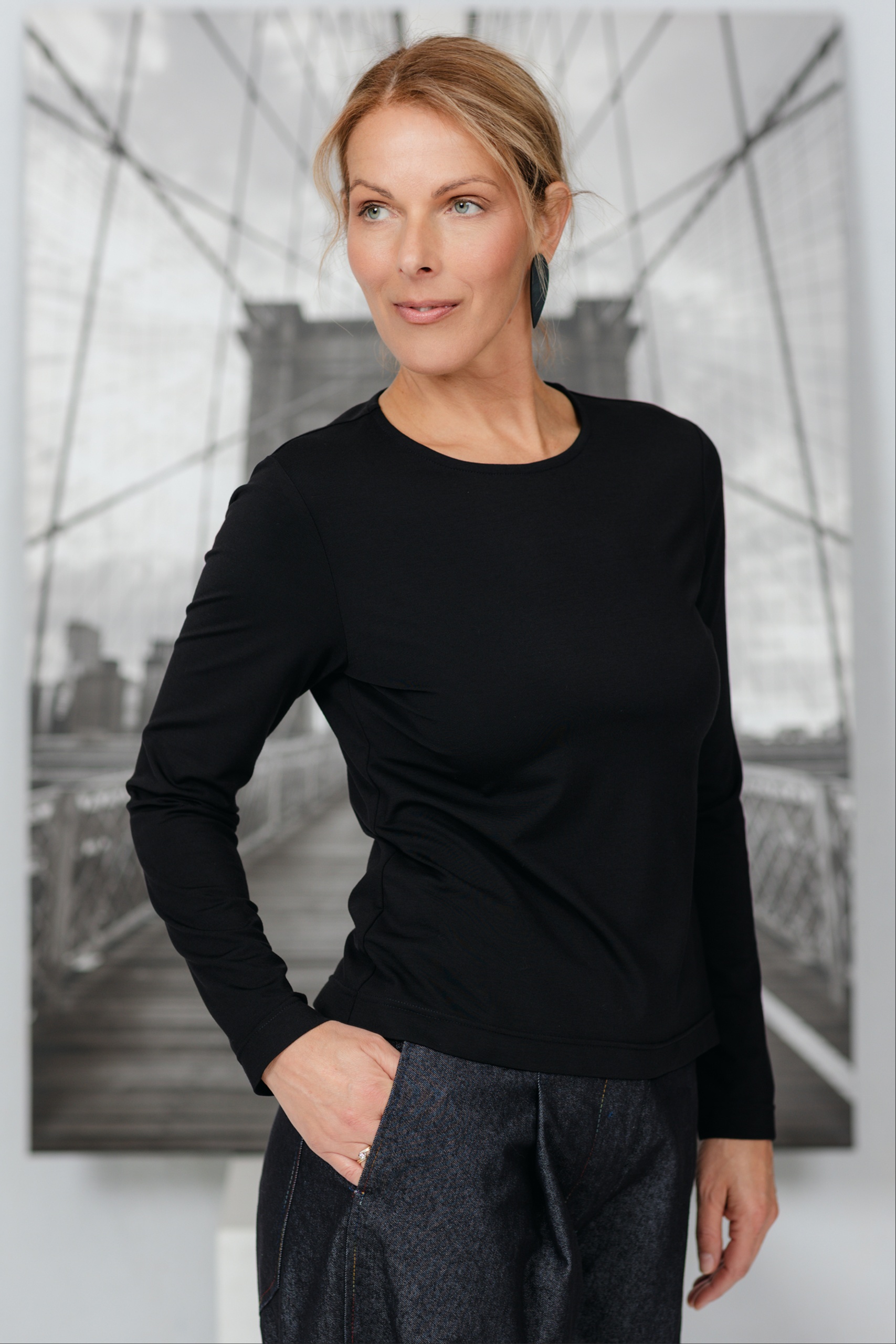 Musta pitkähihainen T-paita, joka on todellinen vaatekaapin perusvaate. Minimalistisella leikkauksellaan ja pehmeällä, vartaloa myötäilevällä materiaalillaan tämä pusero on suunniteltu niille, jotka arvostavat puhtaita linjoja ja maksimaalista mukavuutta. Suora leikkaus tekee siitä yksinkertaisen mutta erittäin monipuolisen vaatekappaleen – ihanteellisen kerrospukeutumiseen tai yksinään käytettäväksi. Yhdistä se suosikkihousuihisi tai -hameeseesi, niin olet valmis päivään, olitpa sitten toimistossa, kotona tai kaupungilla.