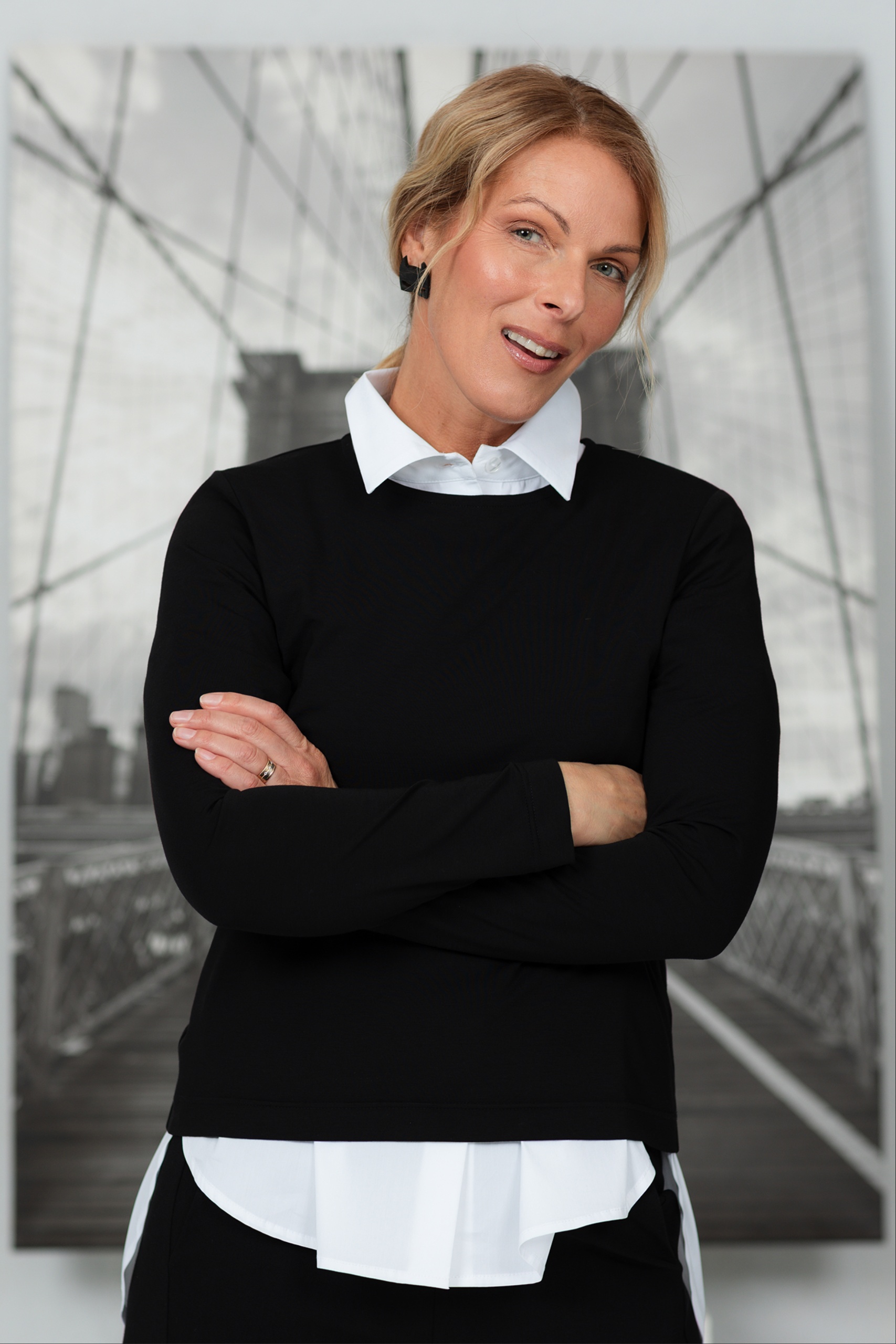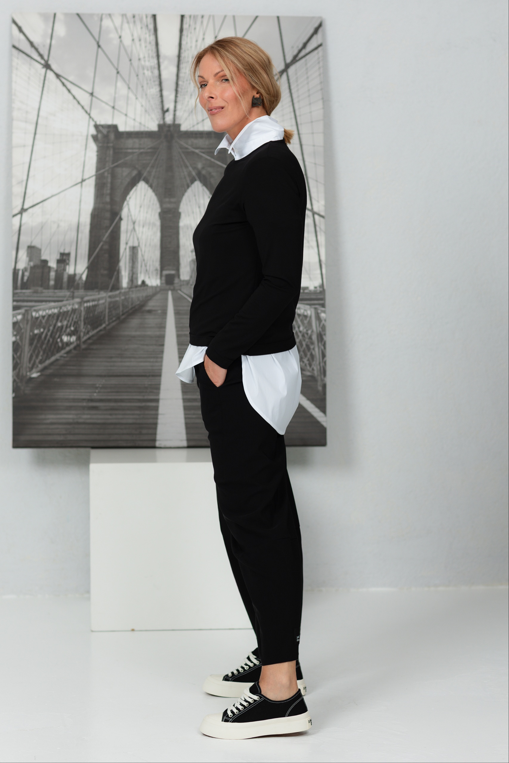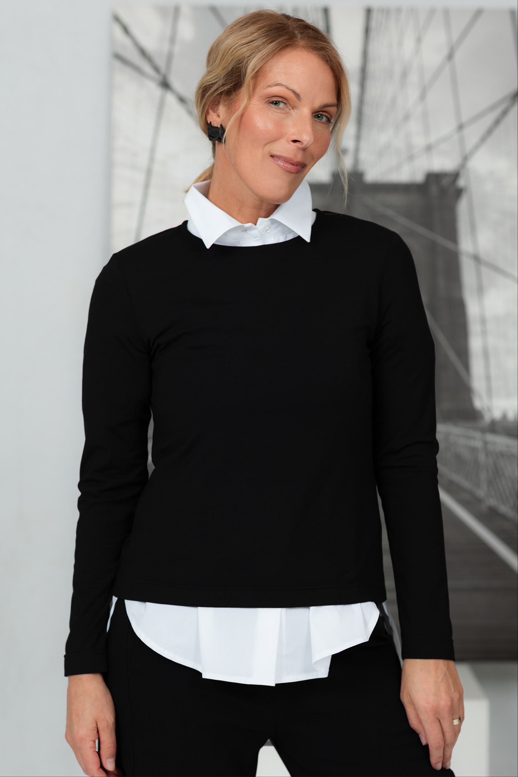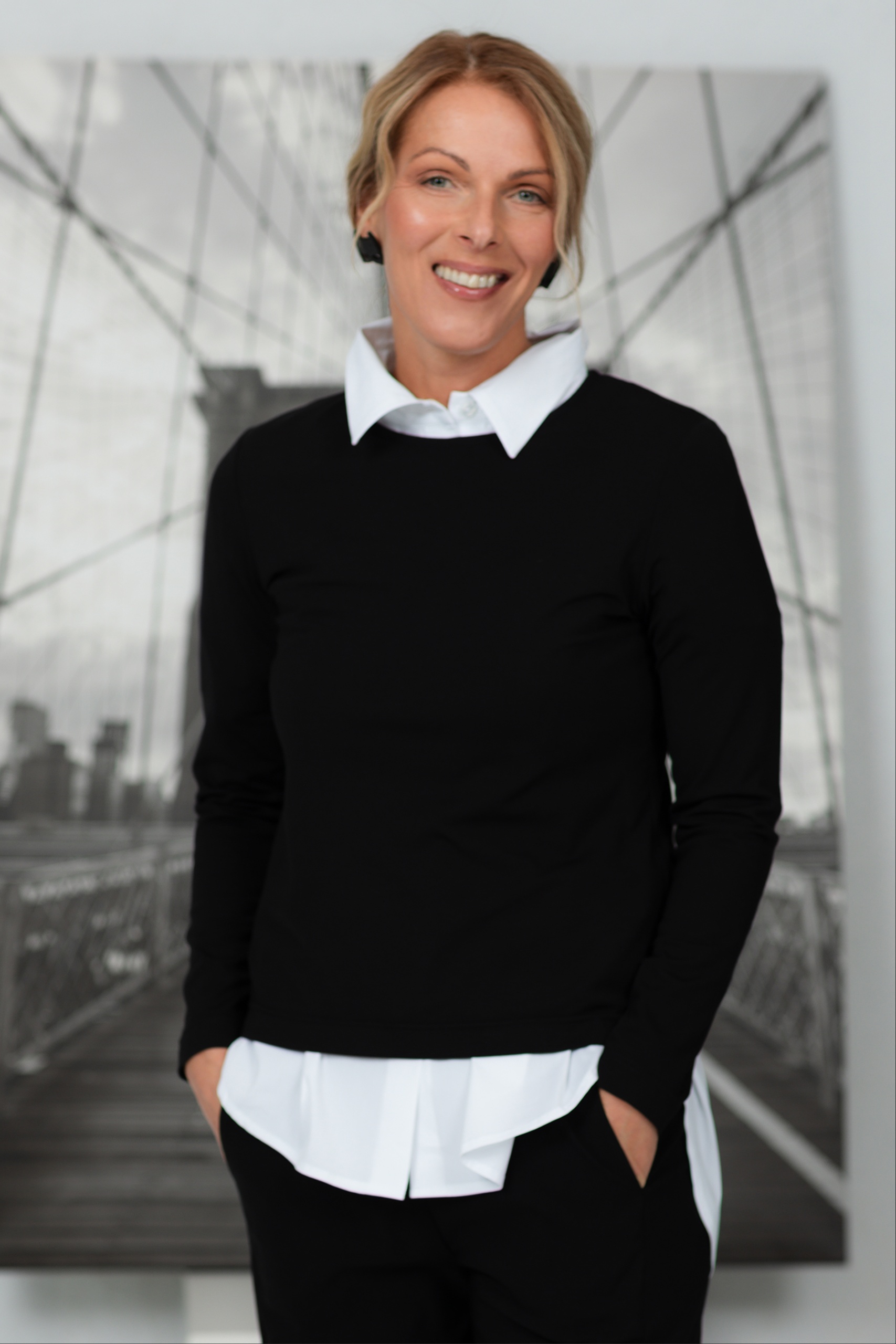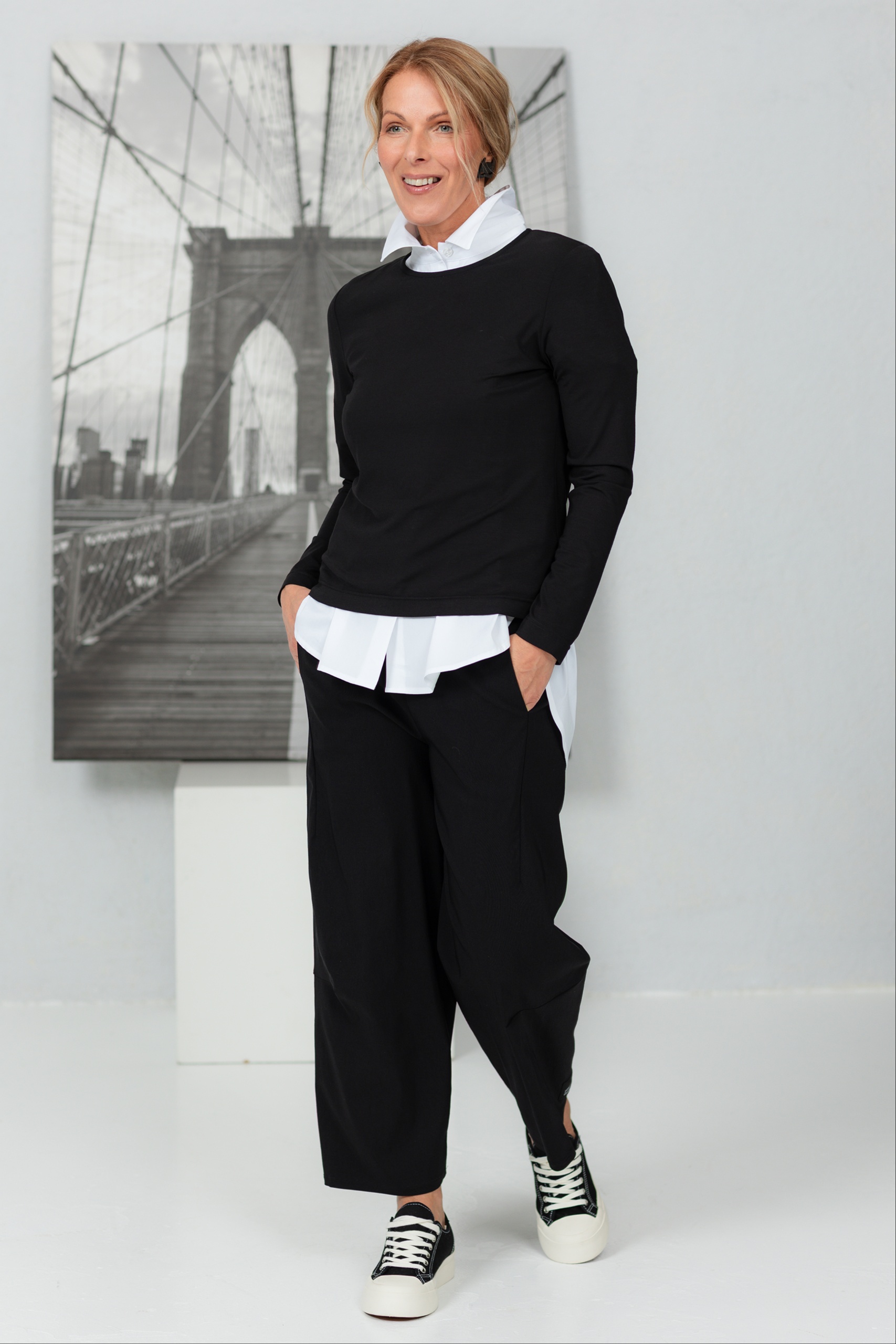 Musta pitkähihainen T-paita, joka on todellinen vaatekaapin perusvaate. Minimalistisella leikkauksellaan ja pehmeällä, vartaloa myötäilevällä materiaalillaan tämä pusero on suunniteltu niille, jotka arvostavat puhtaita linjoja ja maksimaalista mukavuutta. Suora leikkaus tekee siitä yksinkertaisen mutta erittäin monipuolisen vaatekappaleen – ihanteellisen kerrospukeutumiseen tai yksinään käytettäväksi. Yhdistä se suosikkihousuihisi tai -hameeseesi, niin olet valmis päivään, olitpa sitten toimistossa, kotona tai kaupungilla.