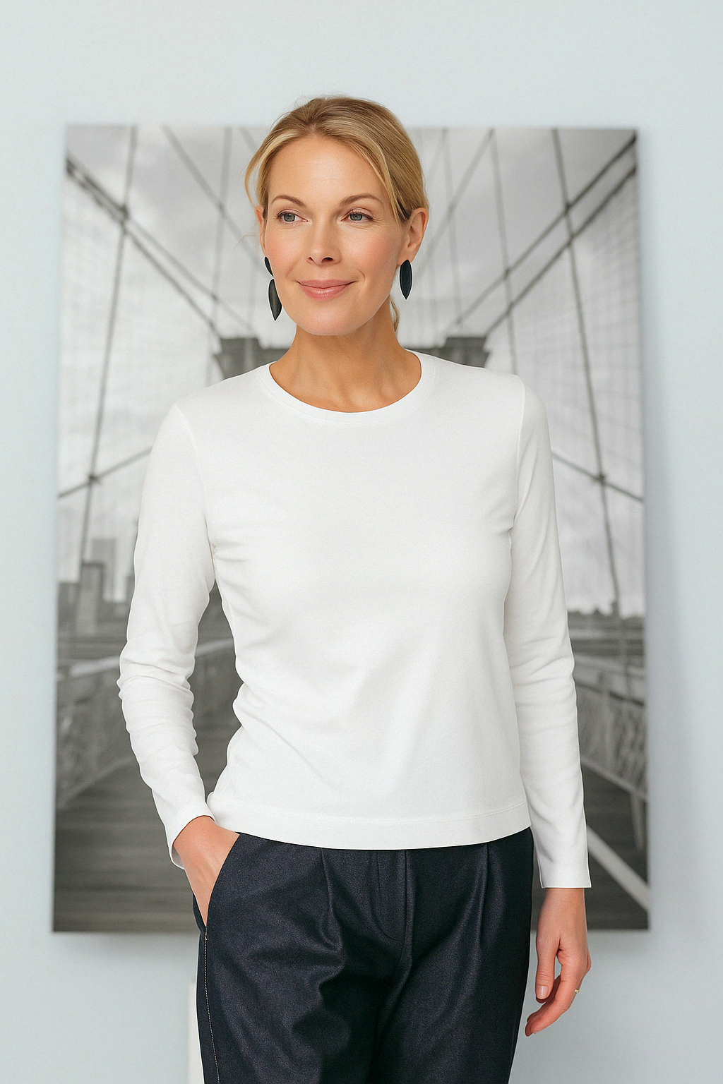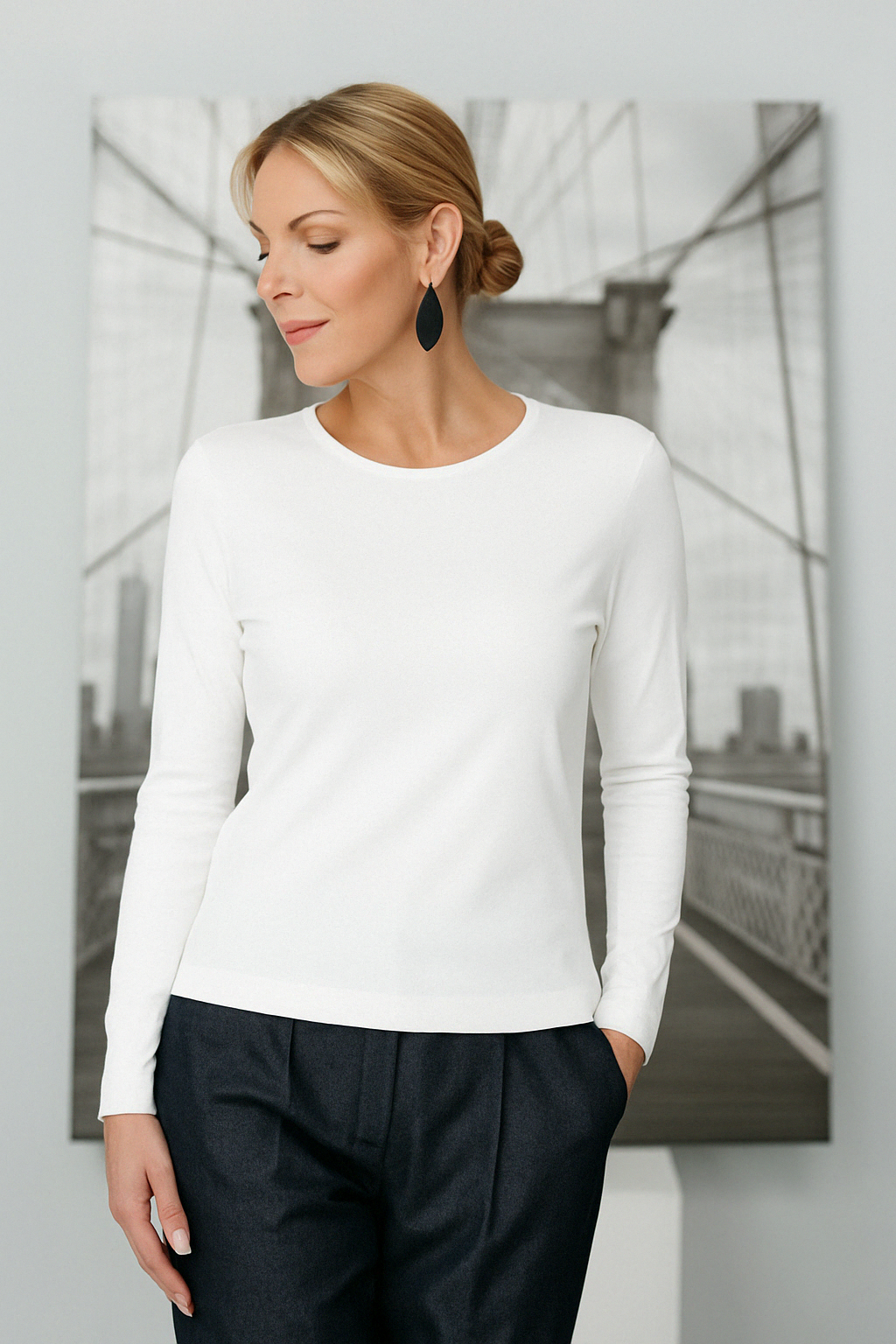 Valkoinen pitkähihainen T-paita, joka on todellinen vaatekaapin perusvaate. Minimalistisella leikkauksellaan ja pehmeällä, vartaloa myötäilevällä materiaalillaan tämä pusero on suunniteltu niille, jotka arvostavat selkeitä linjoja ja maksimaalista mukavuutta. Suora leikkaus tekee siitä yksinkertaisen mutta erittäin monipuolisen vaatekappaleen – ihanteellisen kerrospukeutumiseen tai yksinään käytettäväksi. Yhdistä se suosikkihousuihisi tai -hameeseesi, niin olet valmis päivään, olitpa sitten toimistossa, kotona tai kaupungilla.