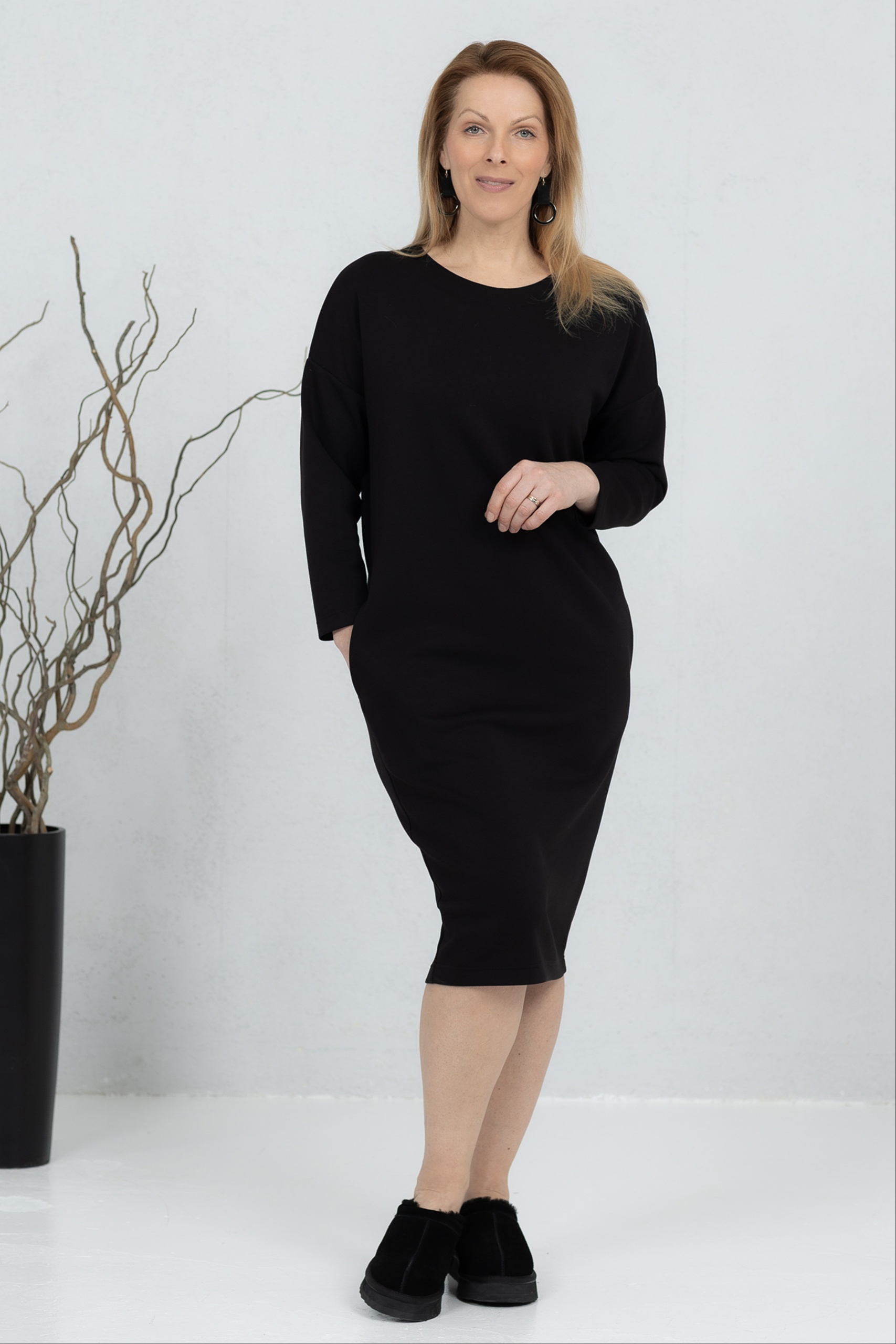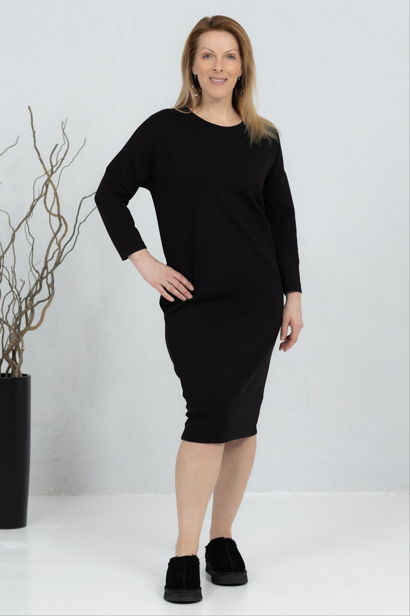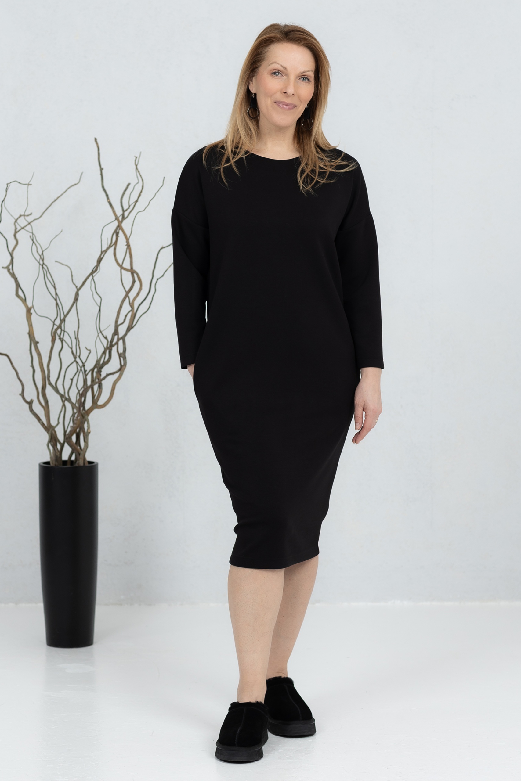 Sanaka, pehmeä viskoosikangas, V-kaula-aukkoinen mekko, musta