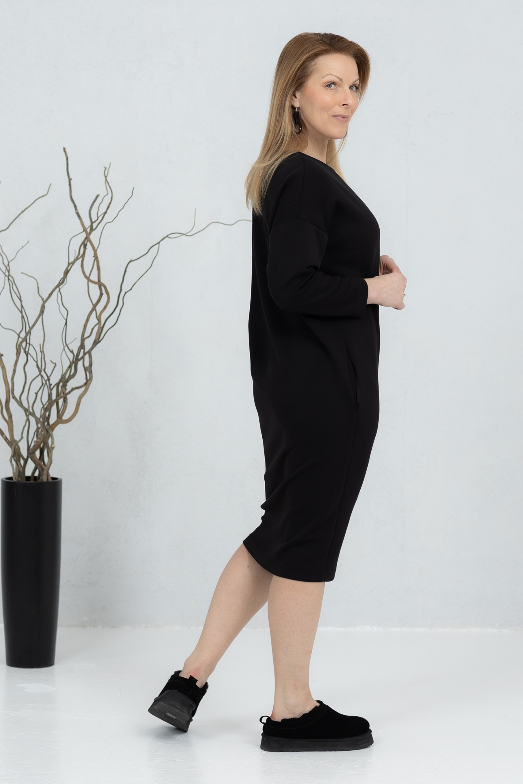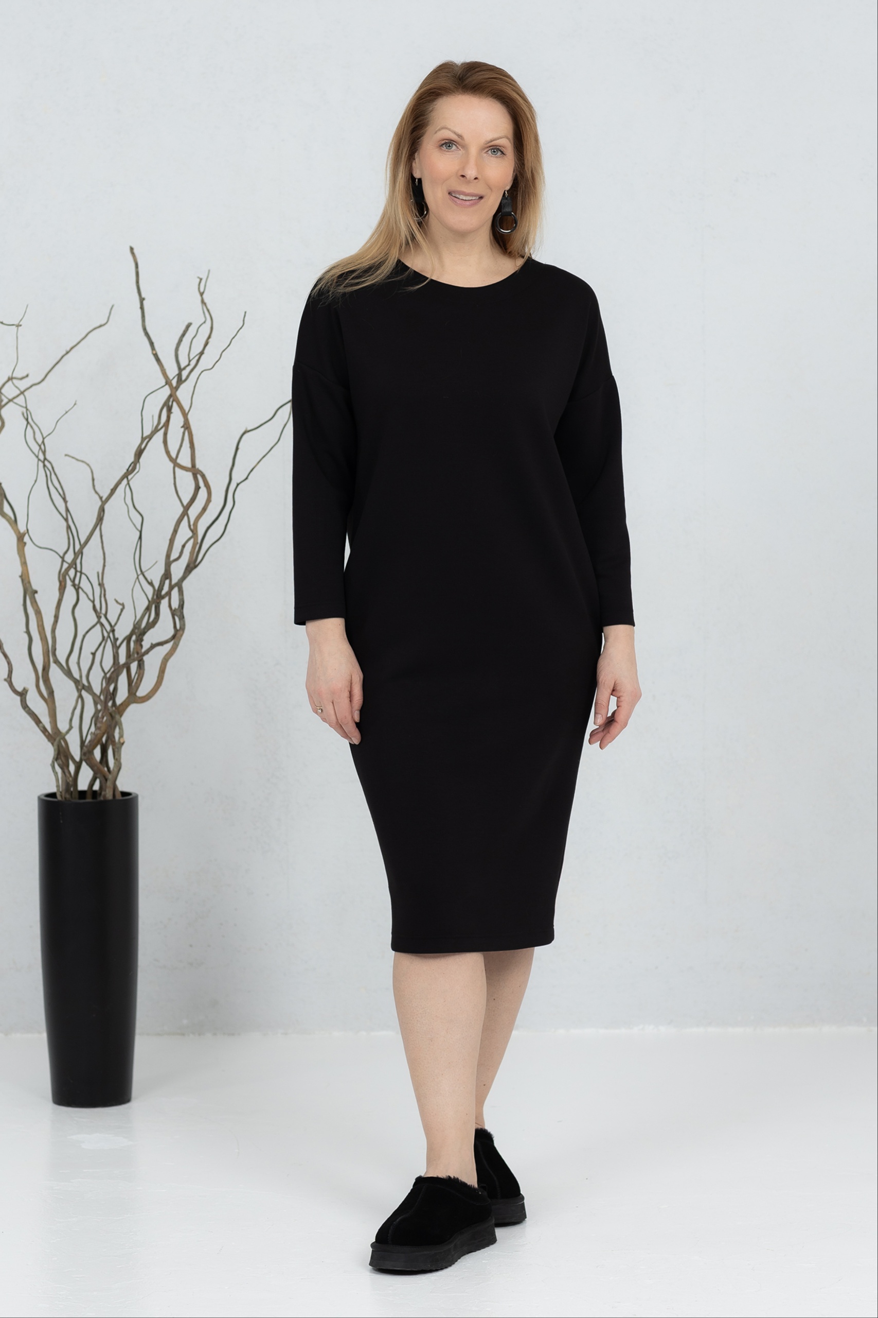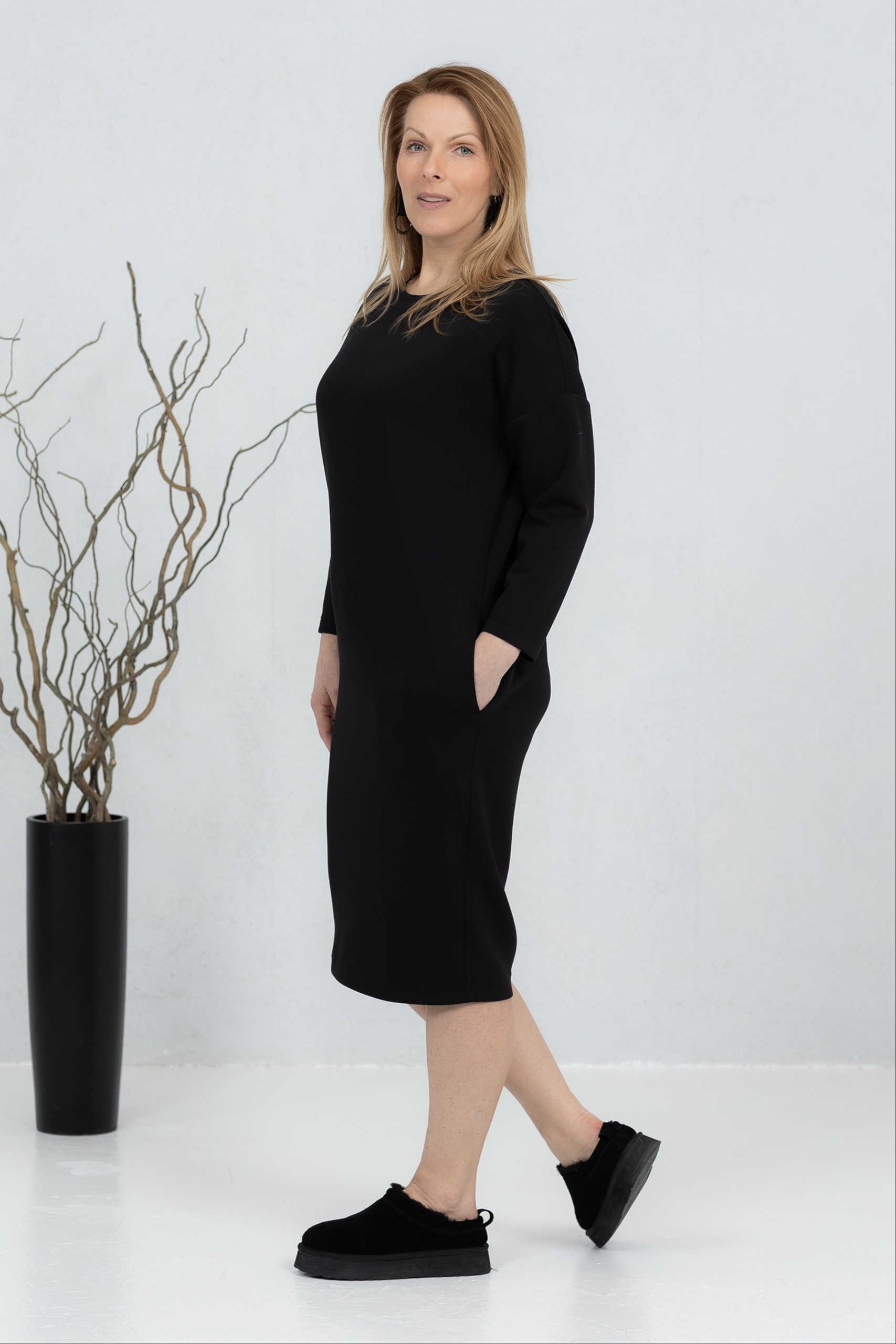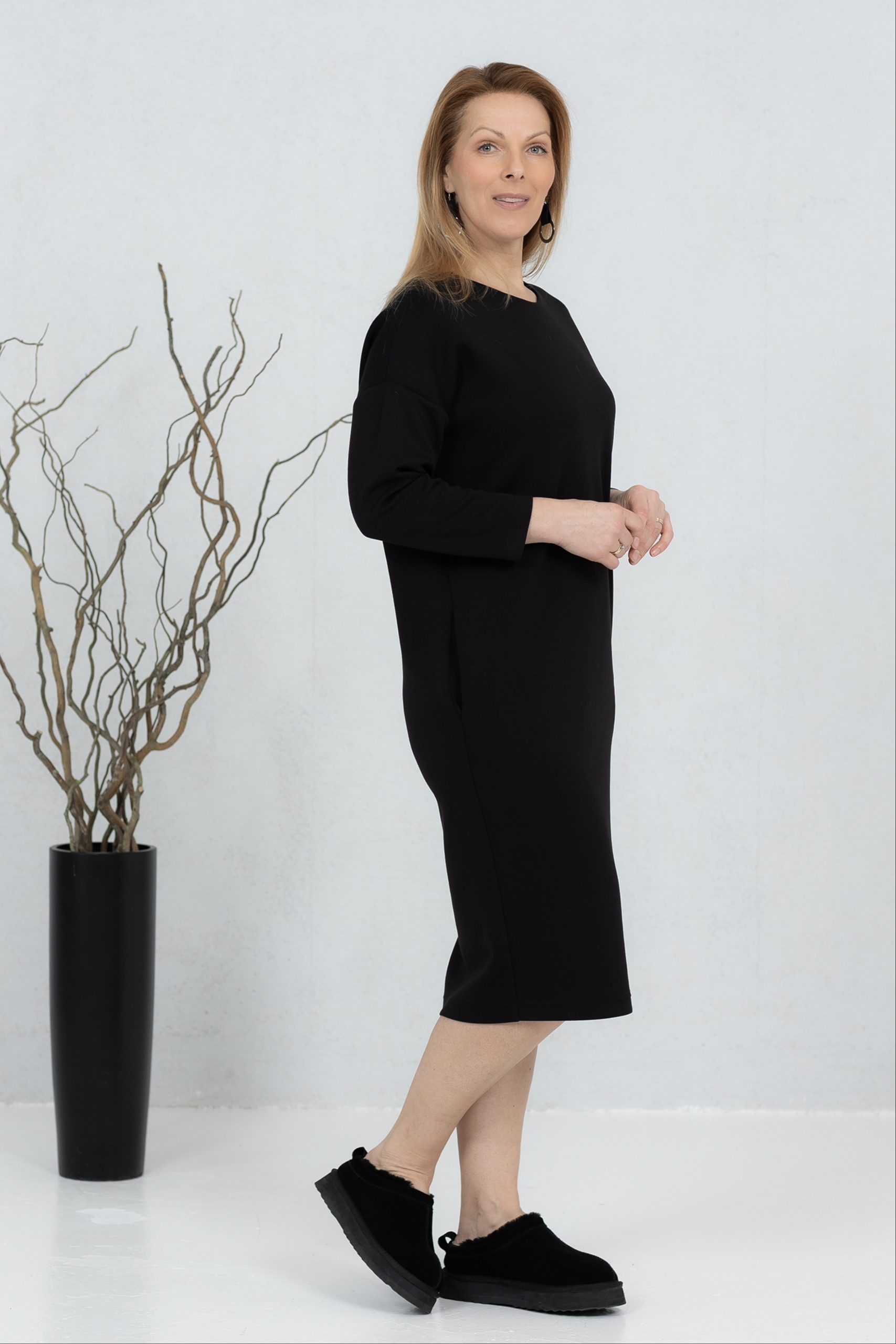 Sanaka, pehmeä viskoosikangas, V-kaula-aukkoinen mekko, musta