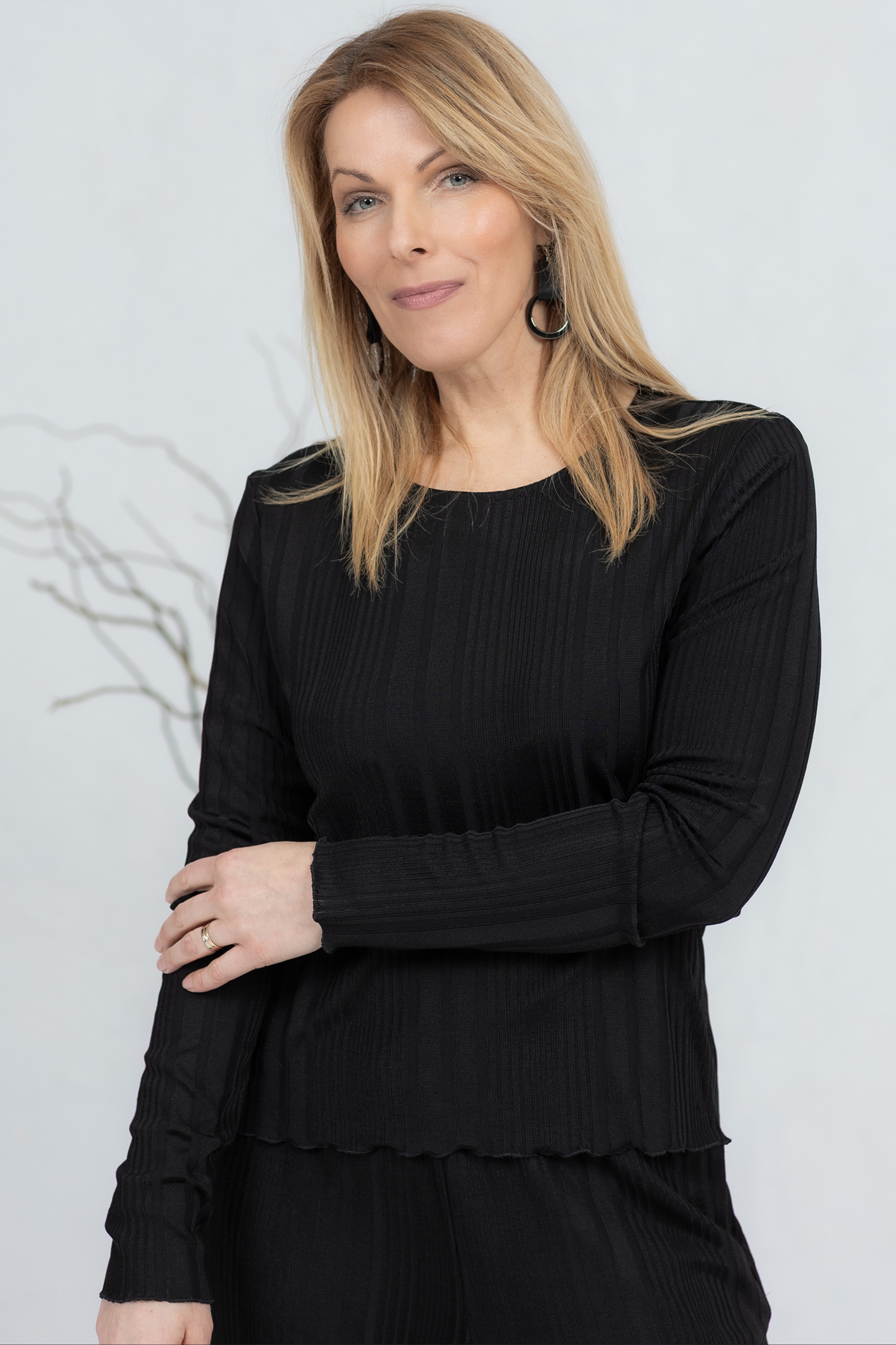 Ribbineulottu pusero, jossa yhdistyvät mukavuus ja yksinkertaisuus. Pehmeä ja joustava kangas tekee siitä ihanteellisen jokapäiväiseen käyttöön – tyylikäs tarpeeksi myös kodin ulkopuolella. Hieman kuvioitu pinta ja minimalistinen leikkaus luovat ajattoman ilmeen. Sopii sekä rentoutumiseen että mukavaksi lisäykseksi jokapäiväiseen vaatekaappiisi.