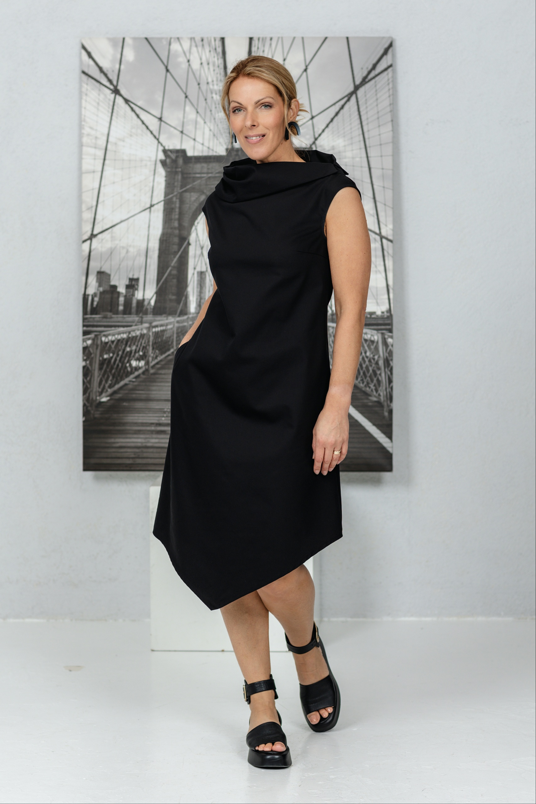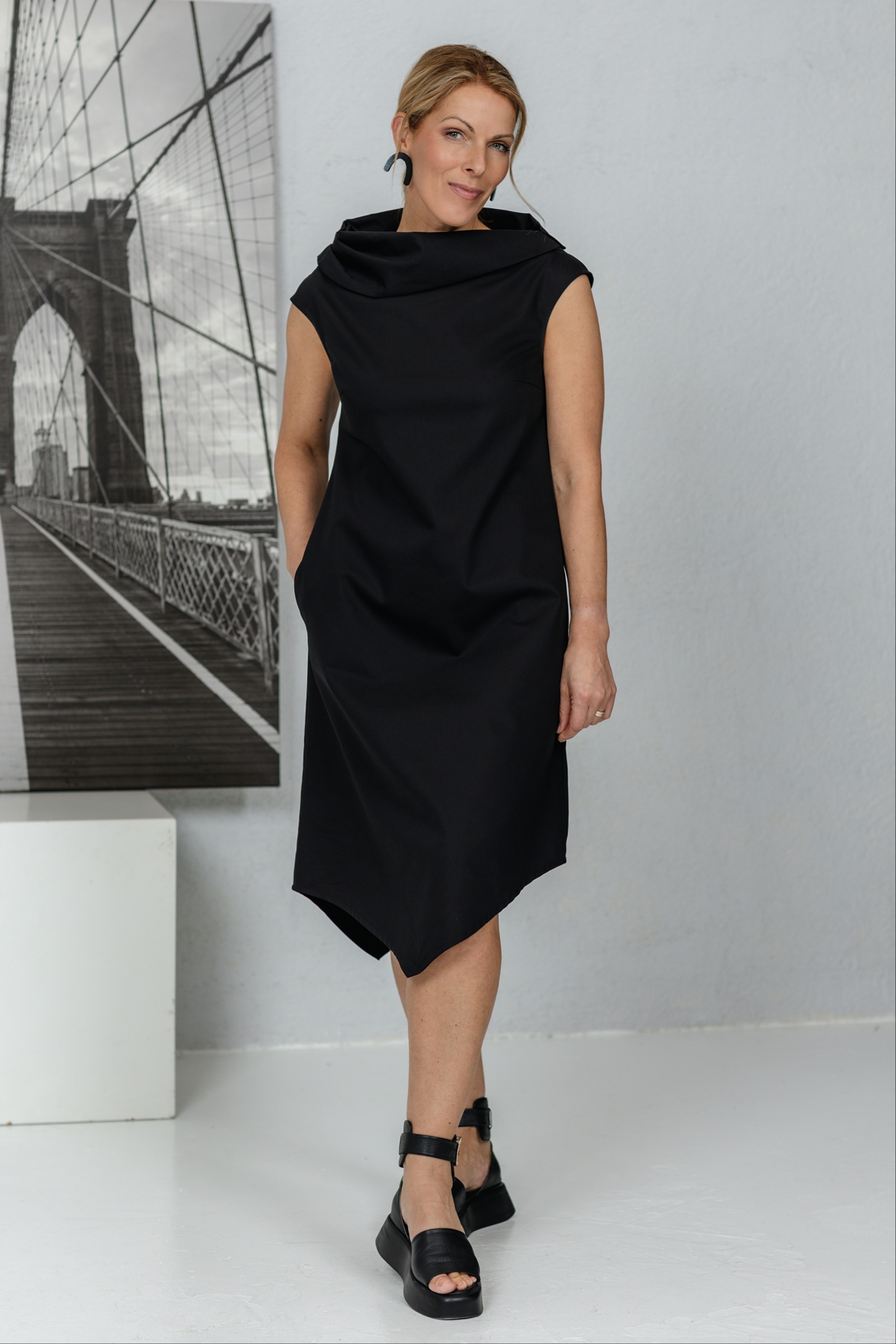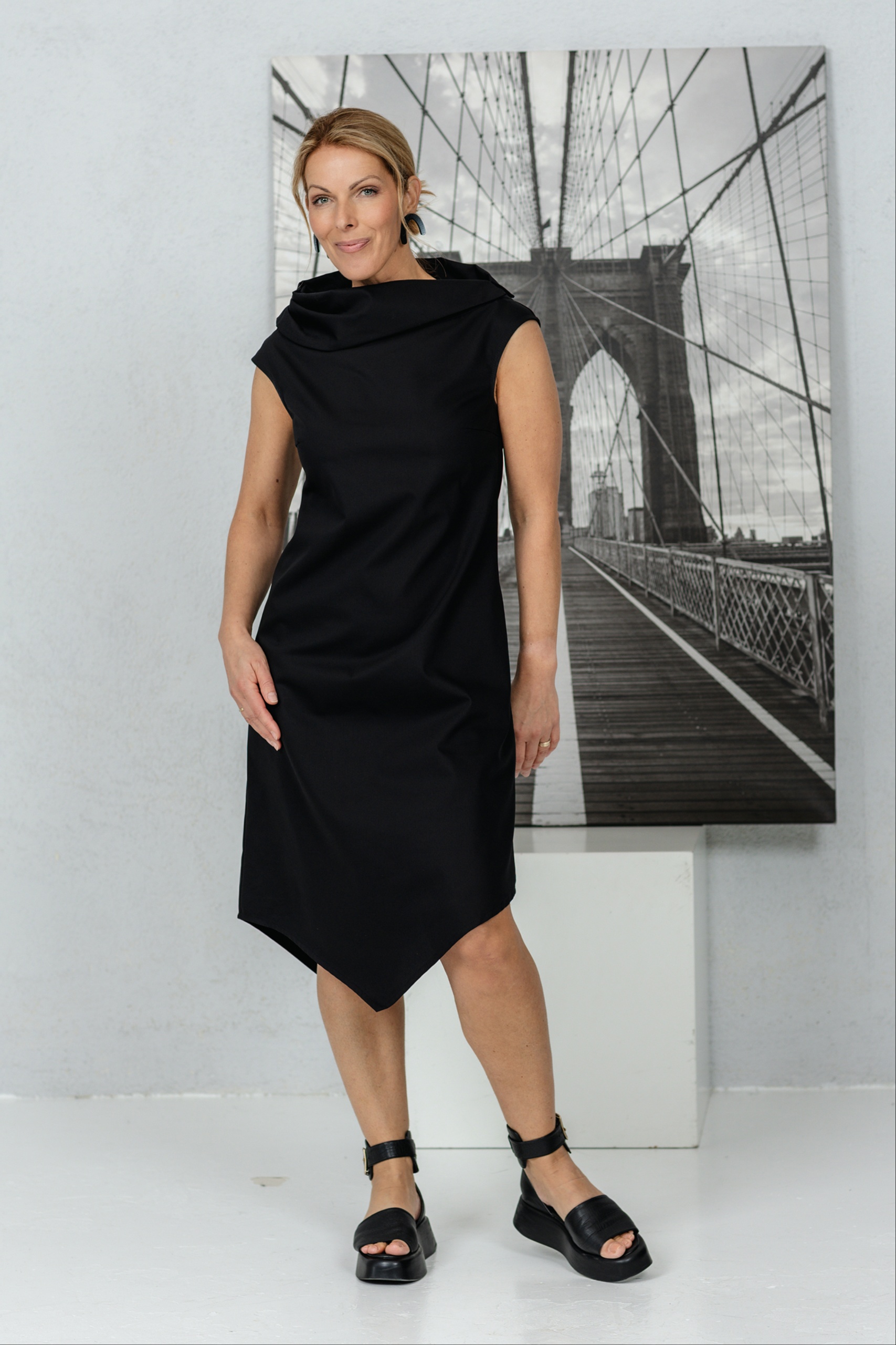 Mekko, joka on suunniteltu naisille, jotka arvostavat moderneja linjoja ja hienovaraista epäsymmetriaa. Veistoksellinen kaulus ja yksinkertainen leikkaus korostavat kesän keveyttä. Epäsymmetrinen, vinosti leikattu helma lisää persoonallisuutta ja rohkeaa eleganssia. Mekko laskeutuu pehmeästi vartalolle, mutta säilyttää muotonsa – yksinkertainen mutta voimakas. Sopii sekä toimistoon että kesän tapahtumiin, kun haluat tuntea olosi erityiseksi ilman vaivannäköä.