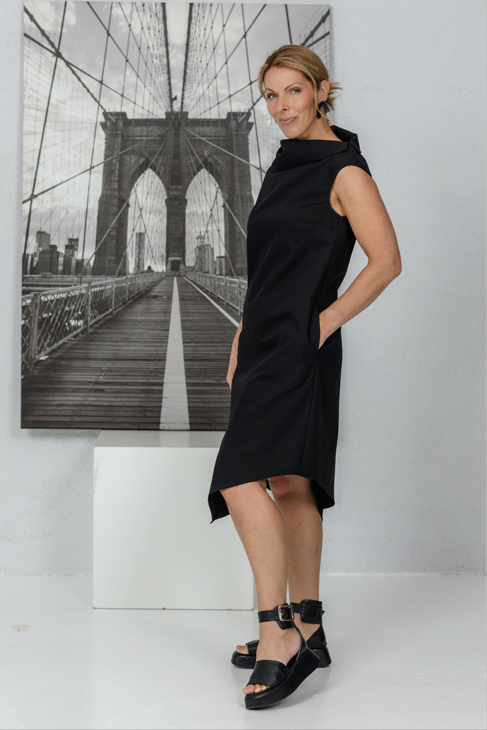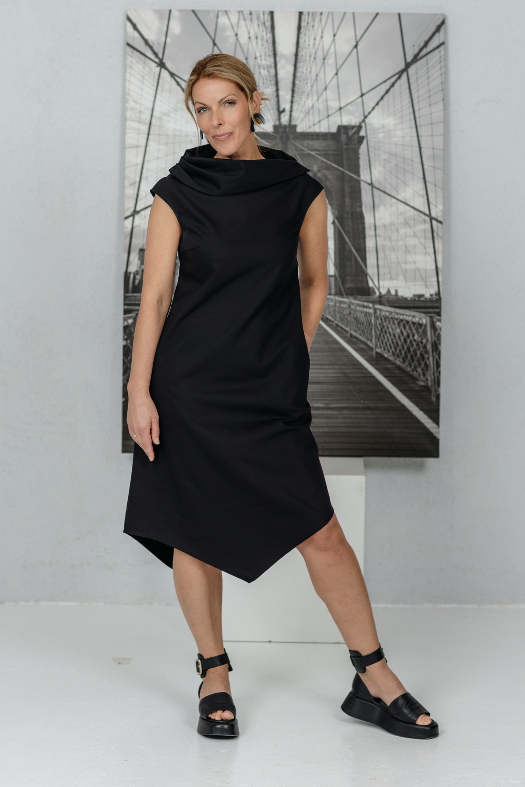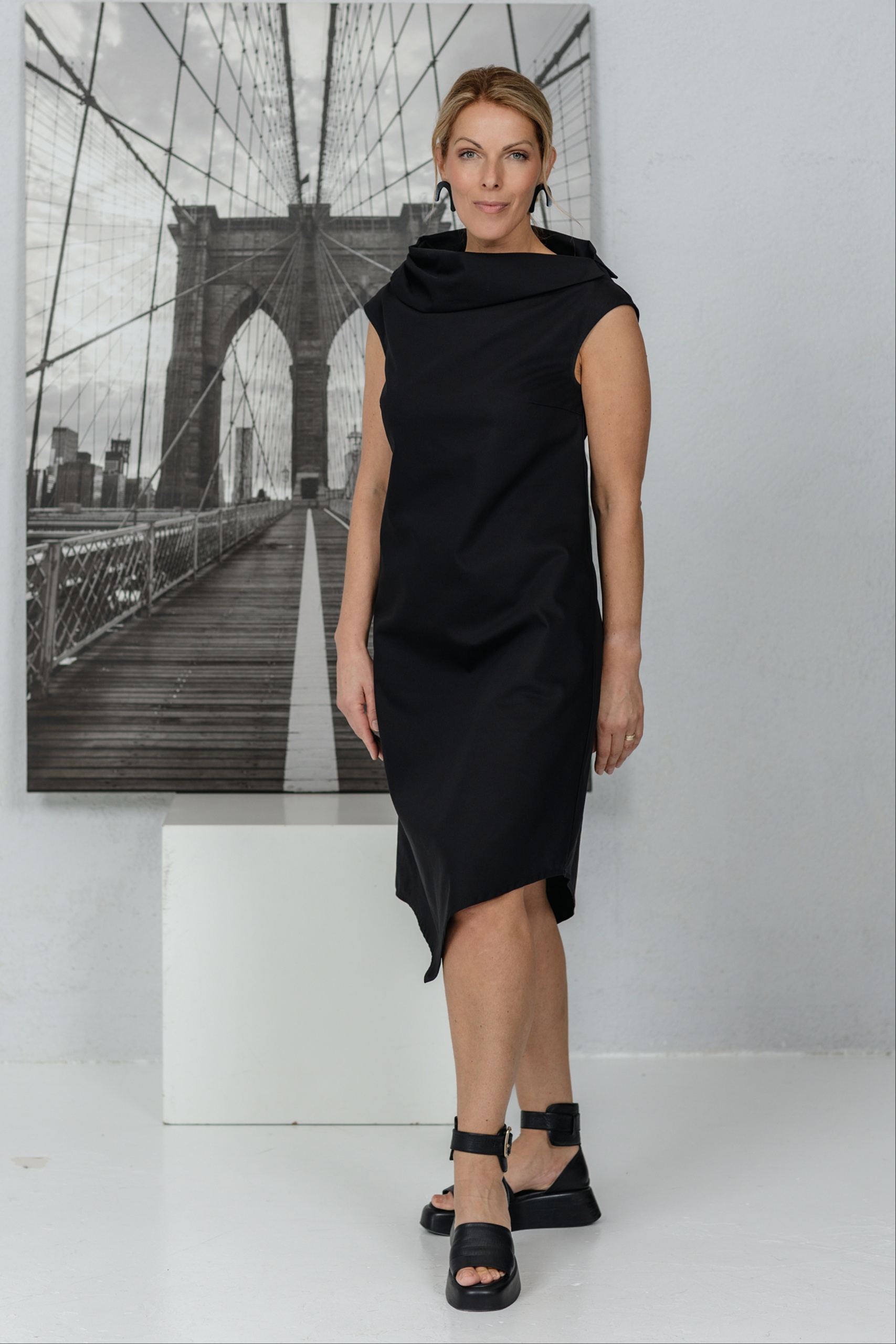 Mekko, joka on suunniteltu naisille, jotka arvostavat moderneja linjoja ja hienovaraista epäsymmetriaa. Veistoksellinen kaulus ja yksinkertainen leikkaus korostavat kesän keveyttä. Epäsymmetrinen, vinosti leikattu helma lisää persoonallisuutta ja rohkeaa eleganssia. Mekko laskeutuu pehmeästi vartalolle, mutta säilyttää muotonsa – yksinkertainen mutta voimakas. Sopii sekä toimistoon että kesän tapahtumiin, kun haluat tuntea olosi erityiseksi ilman vaivannäköä.