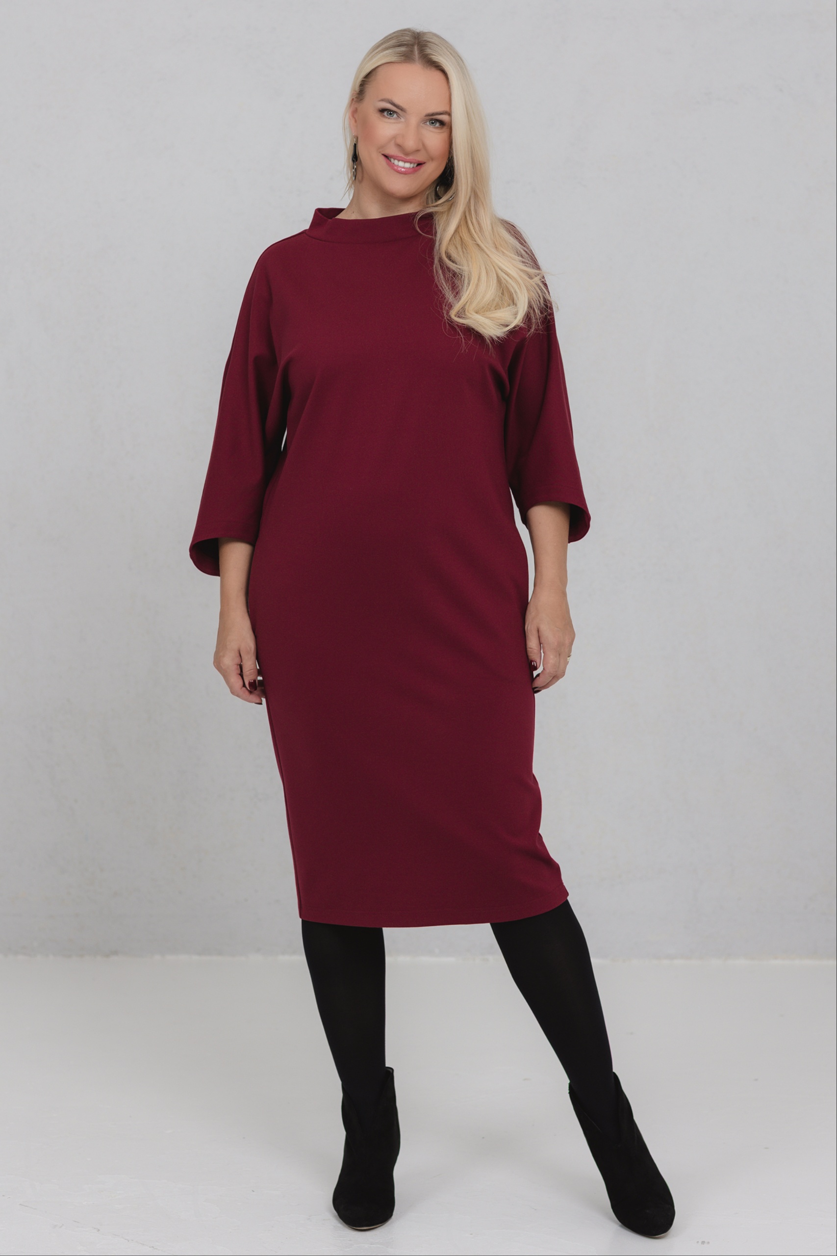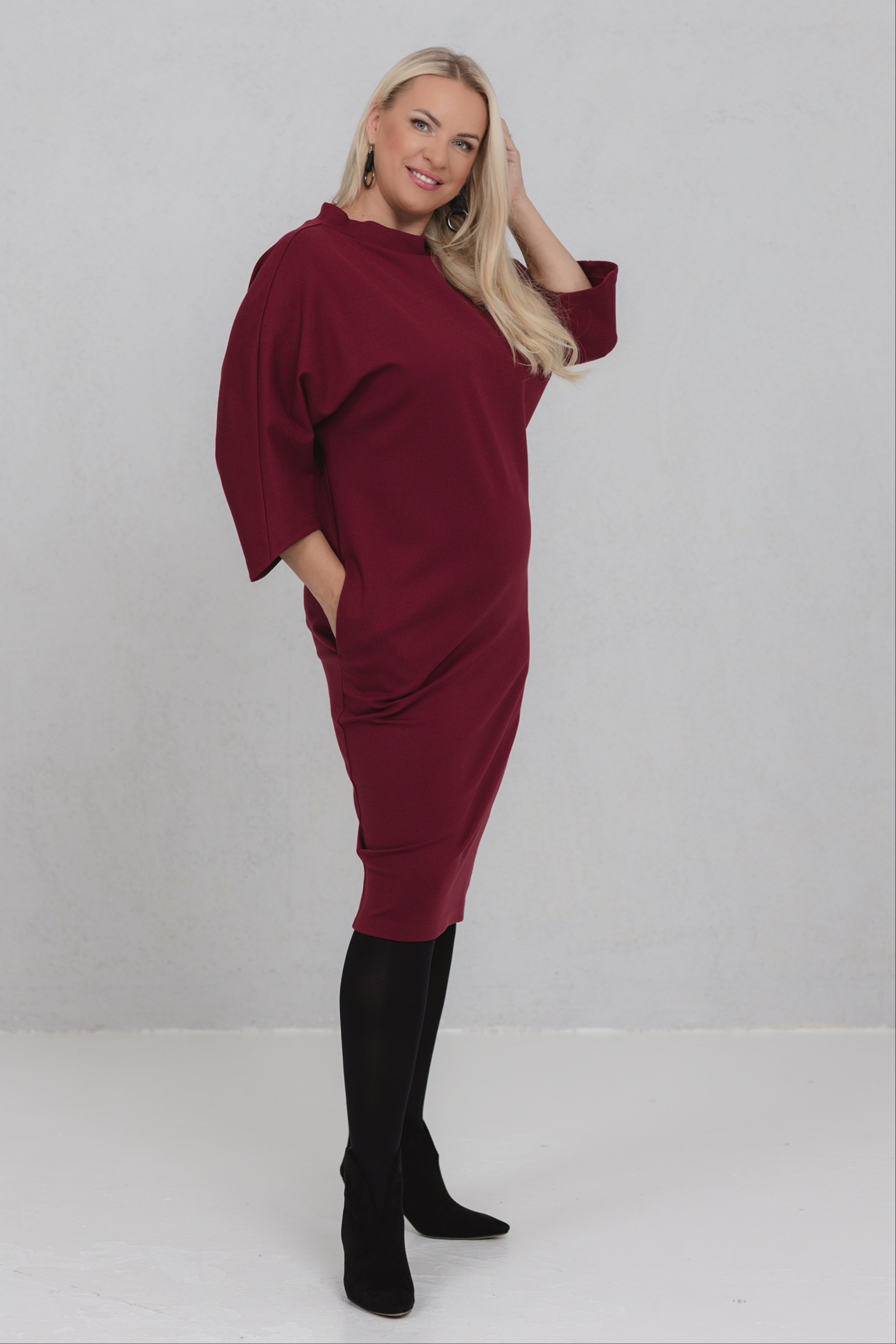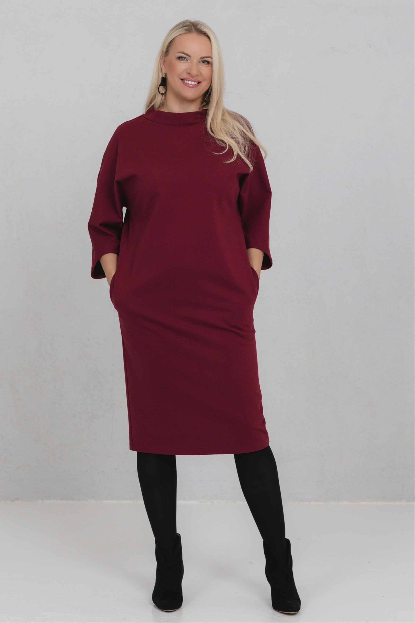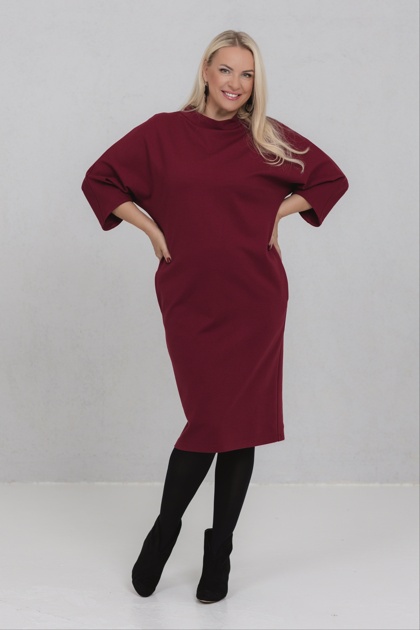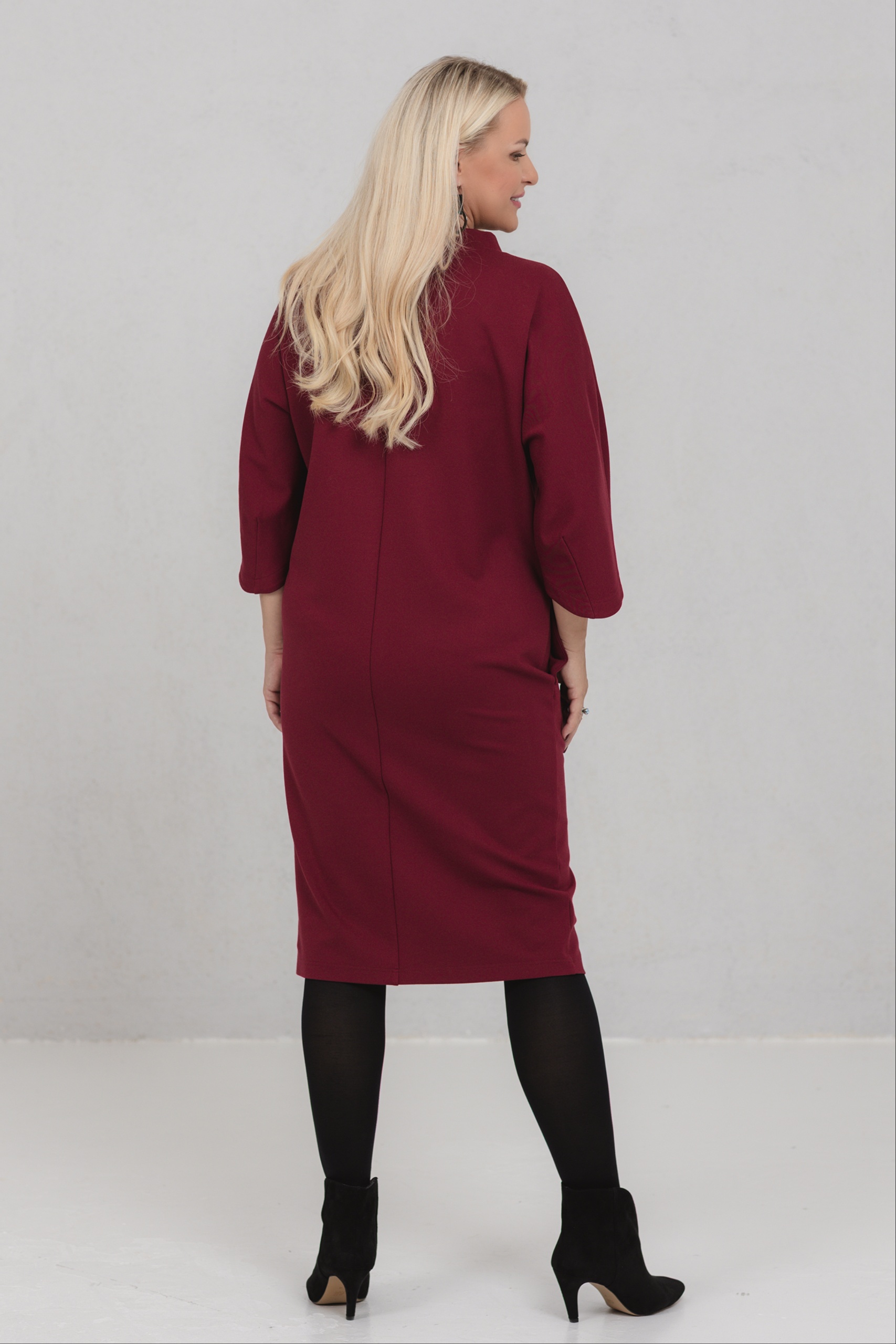Burgundinpunainen mekko, jossa yhdistyvät minimalistinen muoto ja naisellinen voima. Tämän mekon V-muotoinen siluetti sopii erinomaisesti erilaisille vartalotyypeille. Leveät, hieman lasketut hihat lisäävät liikkumavapautta ja luonnetta. Paksu viskoosikangas pitää muotonsa hyvin. Opereta on valinta naisille, jotka arvostavat hillittyä eleganssia ja tietoista läsnäoloa.