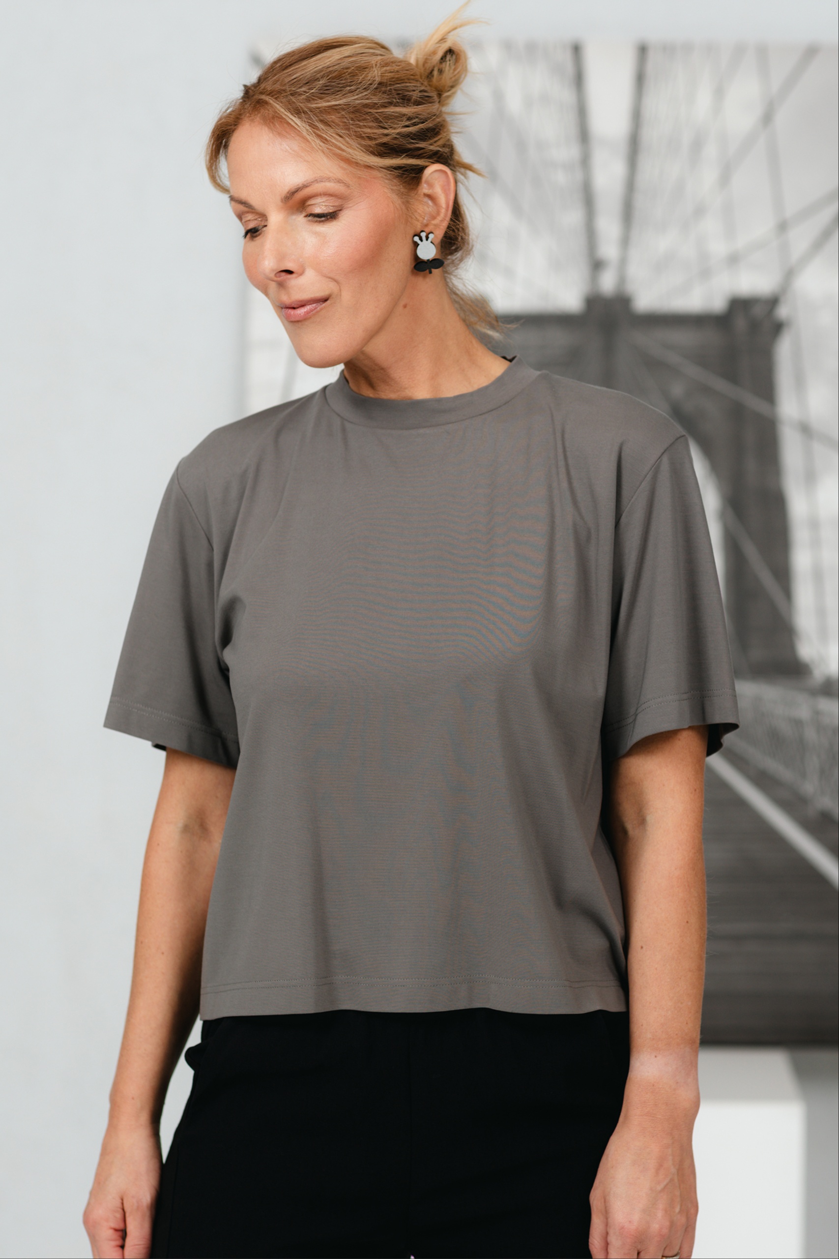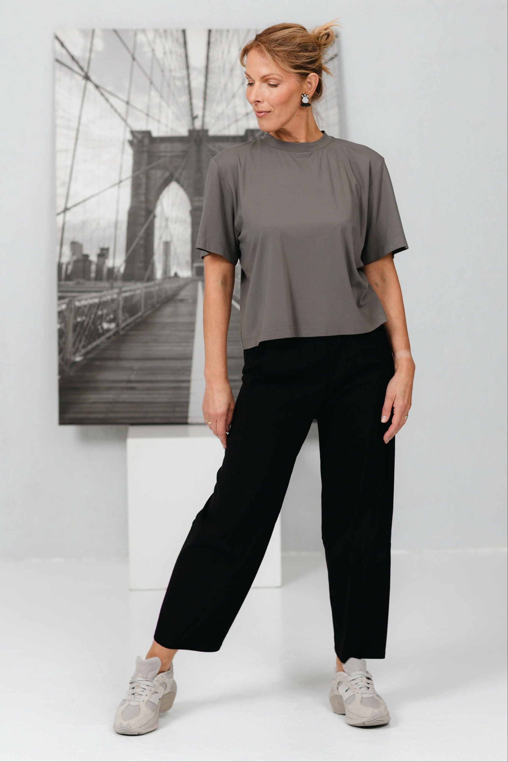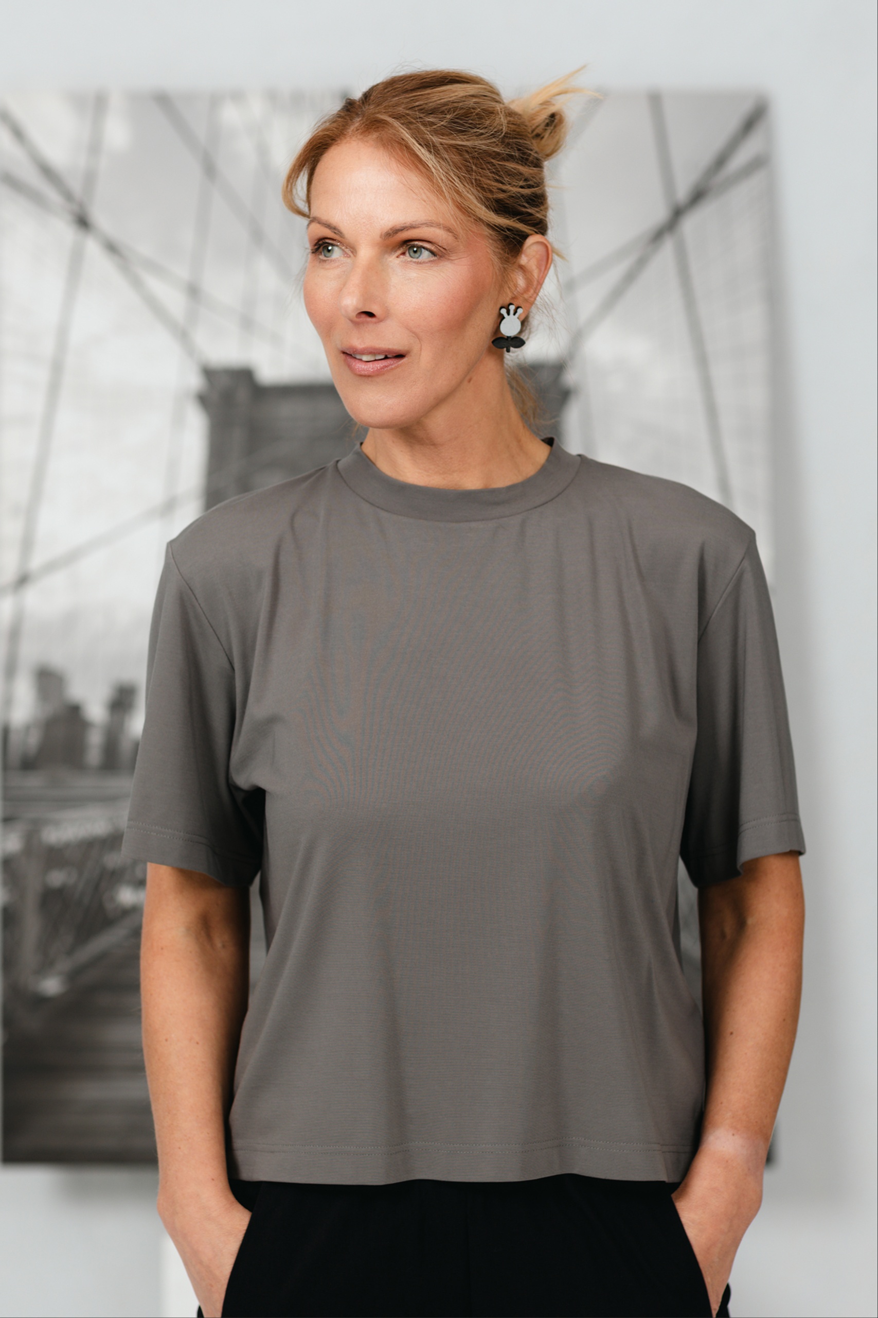 T-paita, joka vie minimalistisen tyylin uudelle tasolle. Tämä klassisen leikkauksen paita on valmistettu pehmeästä ja hengittävästä viskoosikankaasta, joka takaa äärimmäisen mukavuuden käytettäessä. Sen ajaton muotoilu ja neutraali sävy tekevät siitä täydellisen valinnan sekä arjen tyyliin että eleganttiin kerrospukeutumiseen. Sitä voi käyttää farkkujen, housujen tai hameiden kanssa – mahdollisuudet ovat rajattomat! Yksinkertainen mutta tyylikäs T-paita, joka ei koskaan mene muodista.