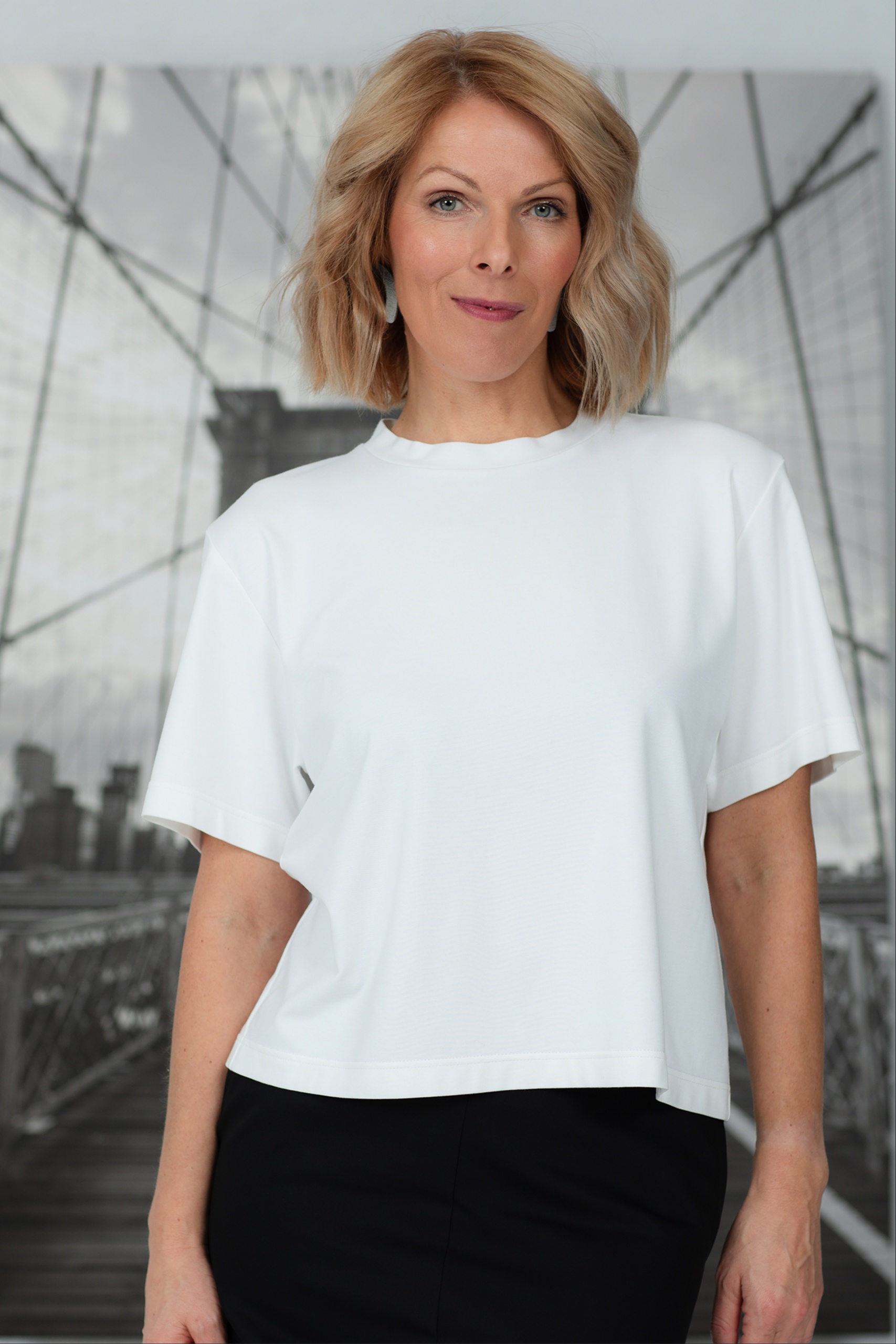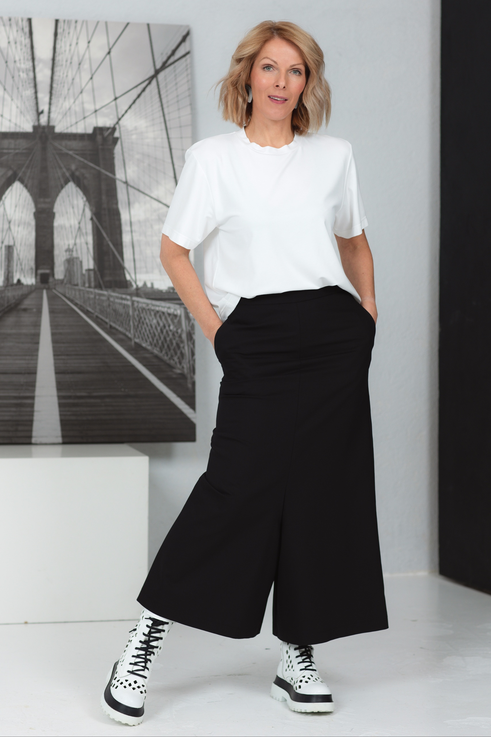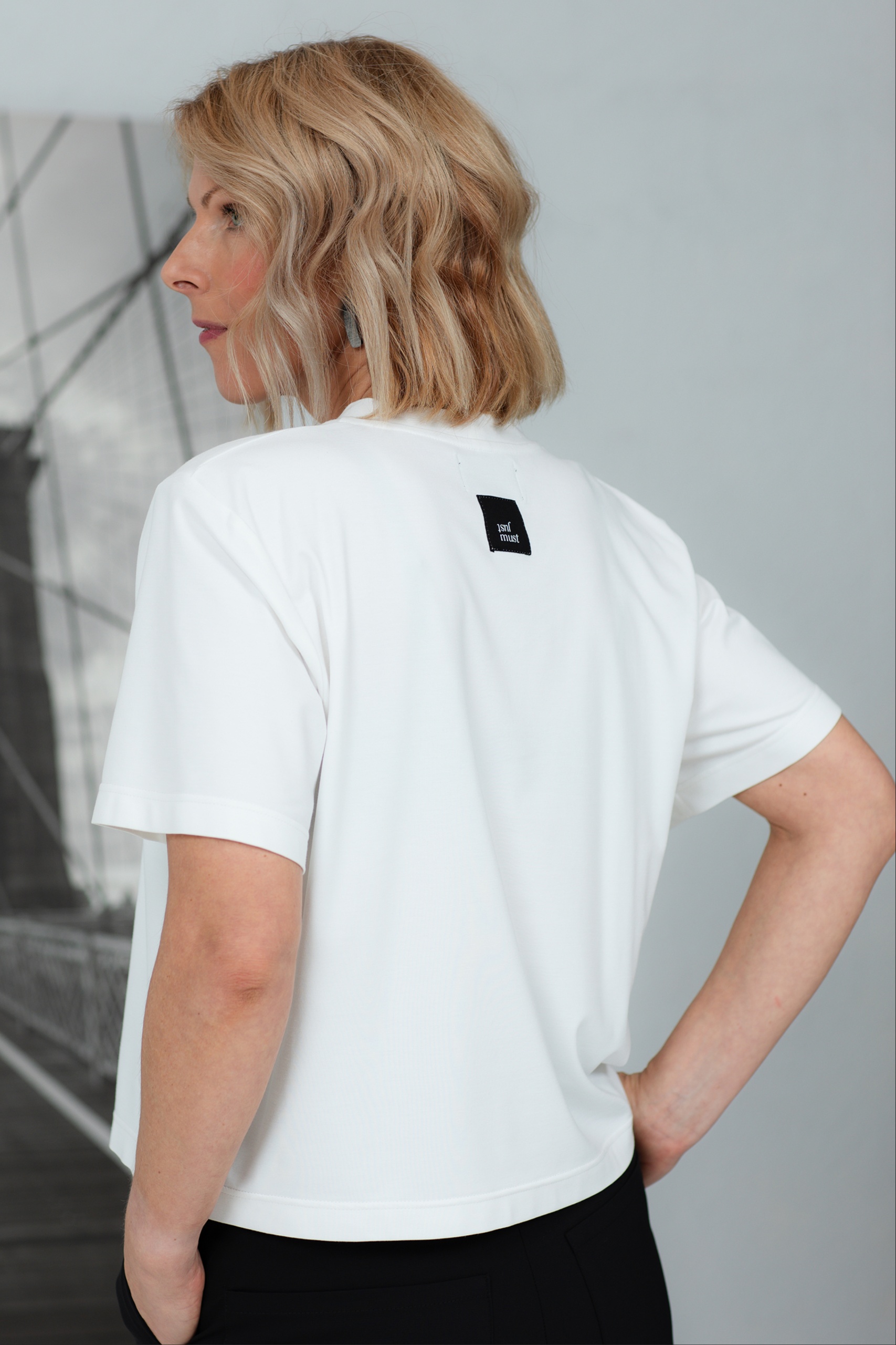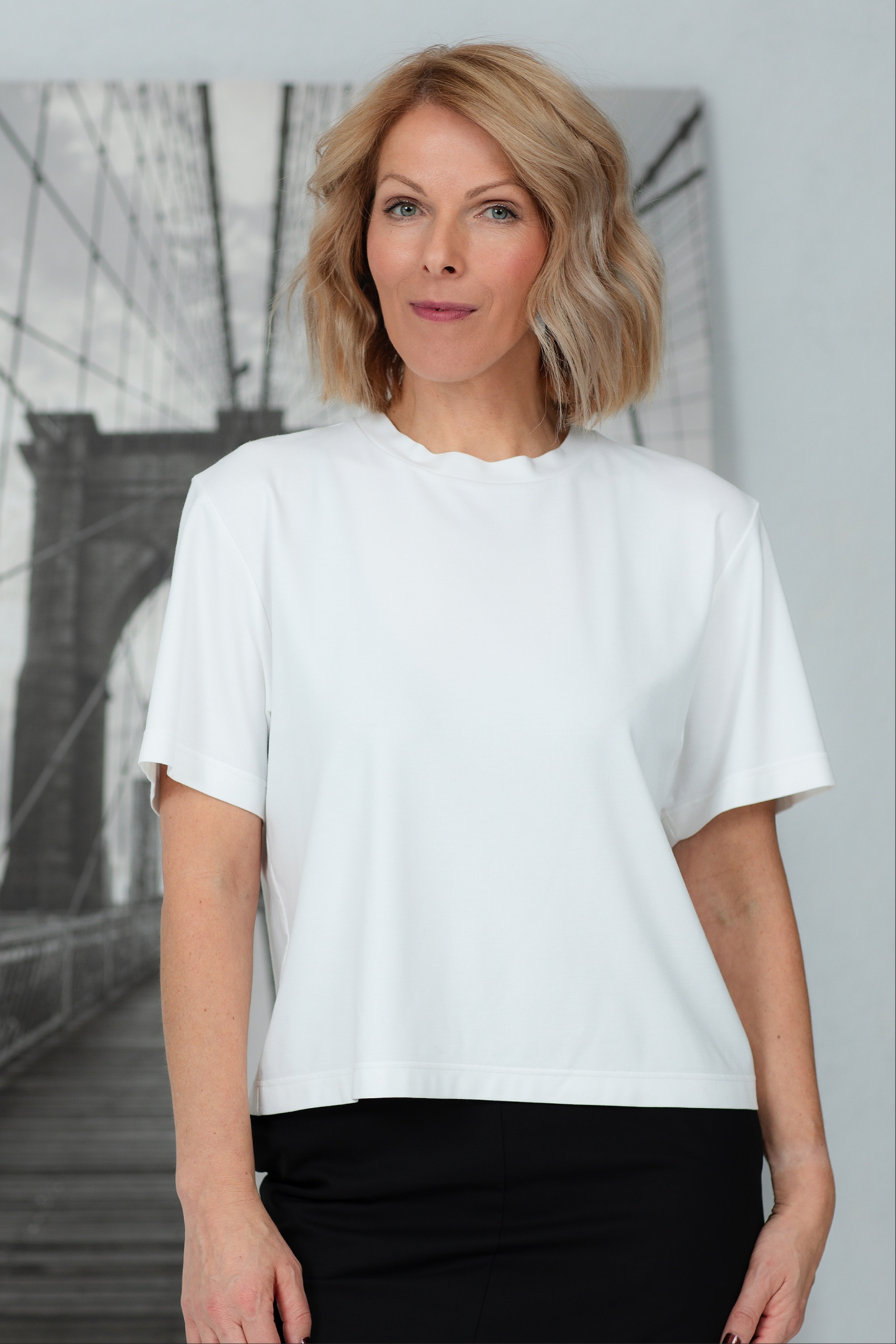 T-paita, joka vie minimalistisen tyylin uudelle tasolle. Tämä klassisen leikkauksen paita on valmistettu pehmeästä ja hengittävästä viskoosikankaasta, joka takaa äärimmäisen mukavuuden käytettäessä. Sen ajaton muotoilu ja neutraali sävy tekevät siitä täydellisen valinnan sekä arjen tyyliin että eleganttiin kerrospukeutumiseen. Sitä voi käyttää farkkujen, housujen tai hameiden kanssa – mahdollisuudet ovat rajattomat! Yksinkertainen mutta tyylikäs T-paita, joka ei koskaan mene muodista.