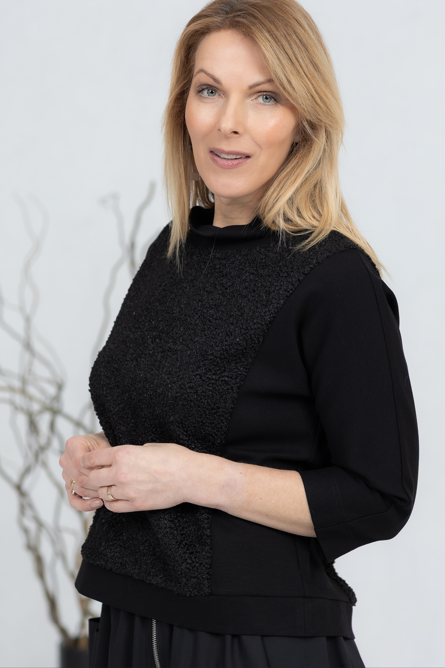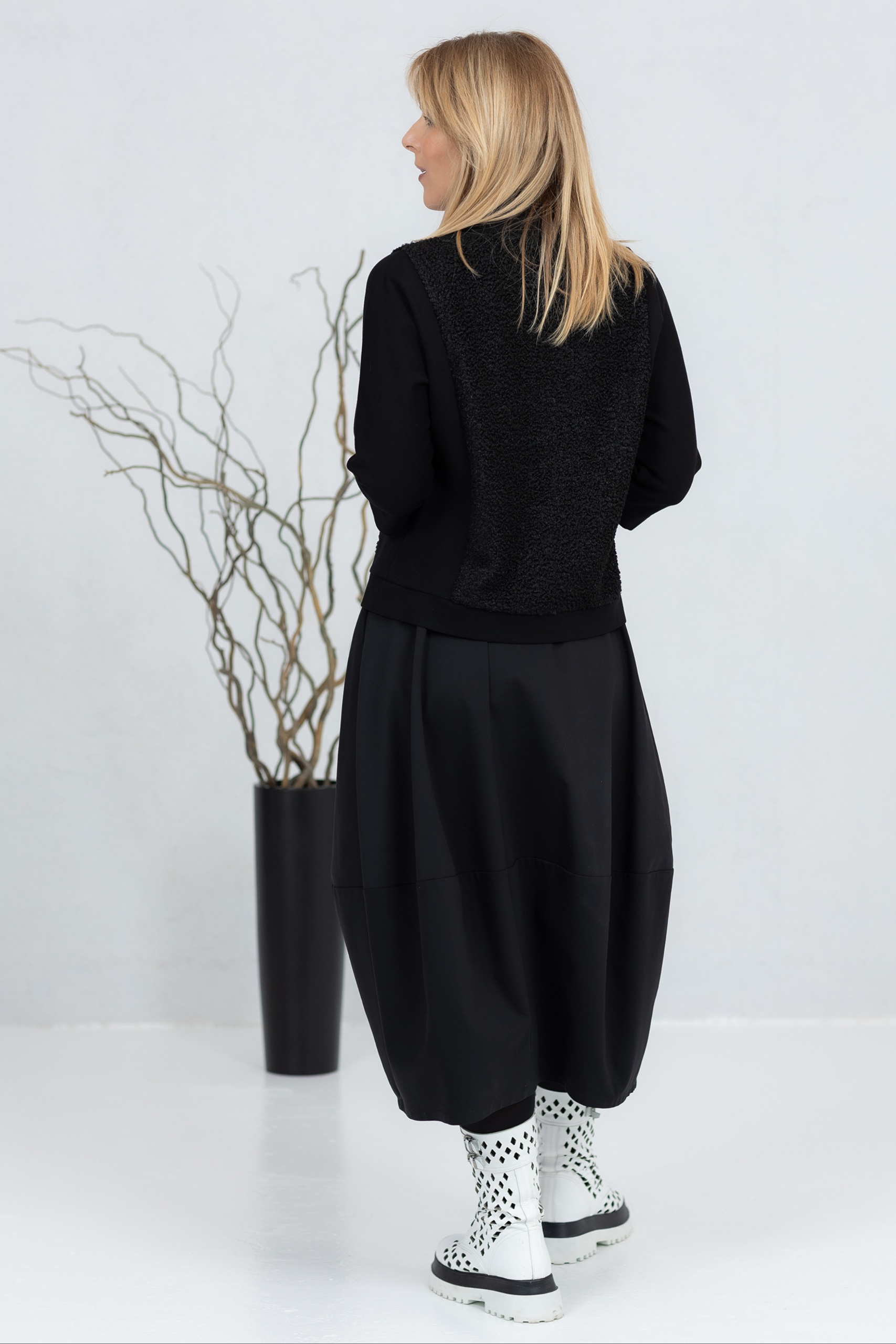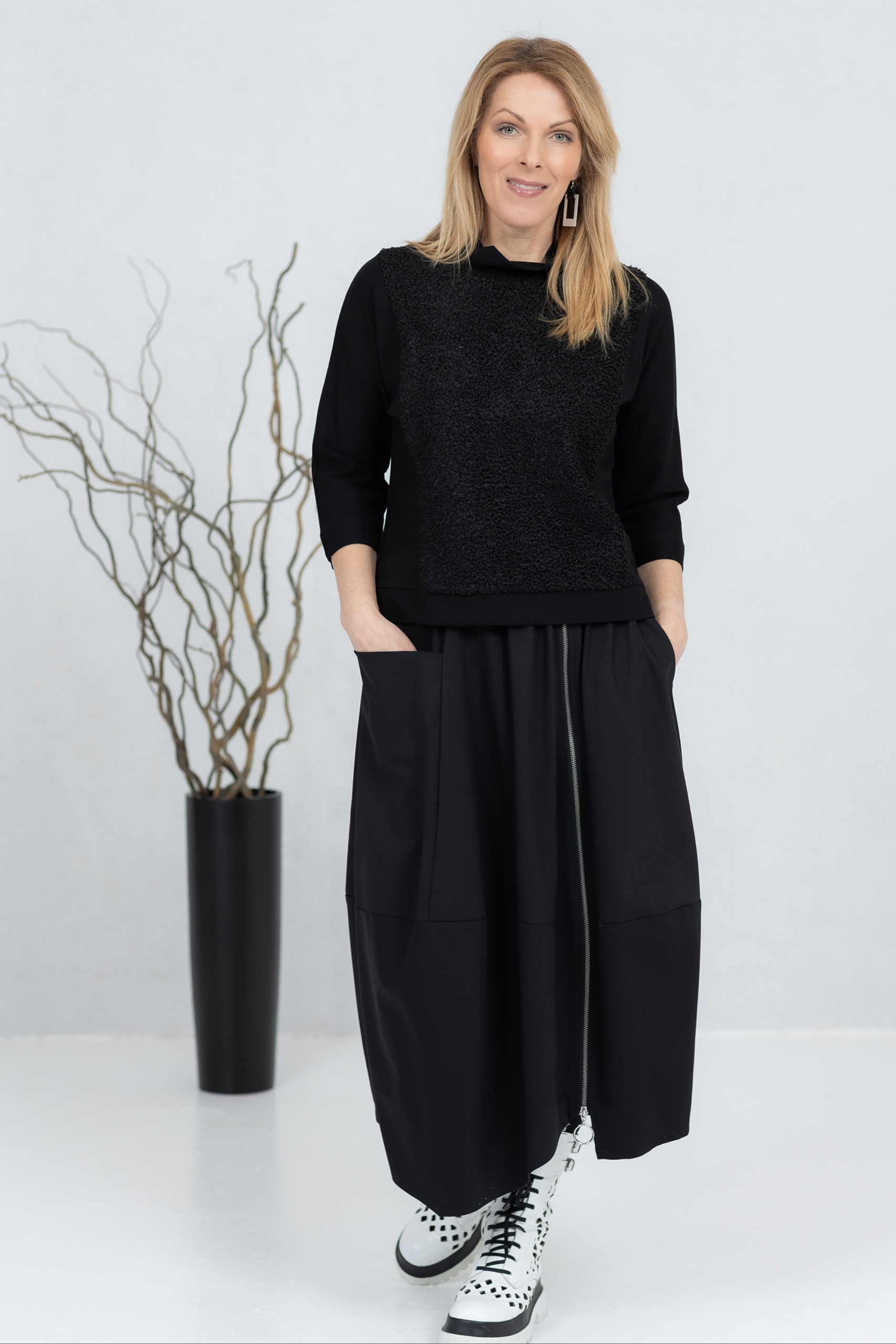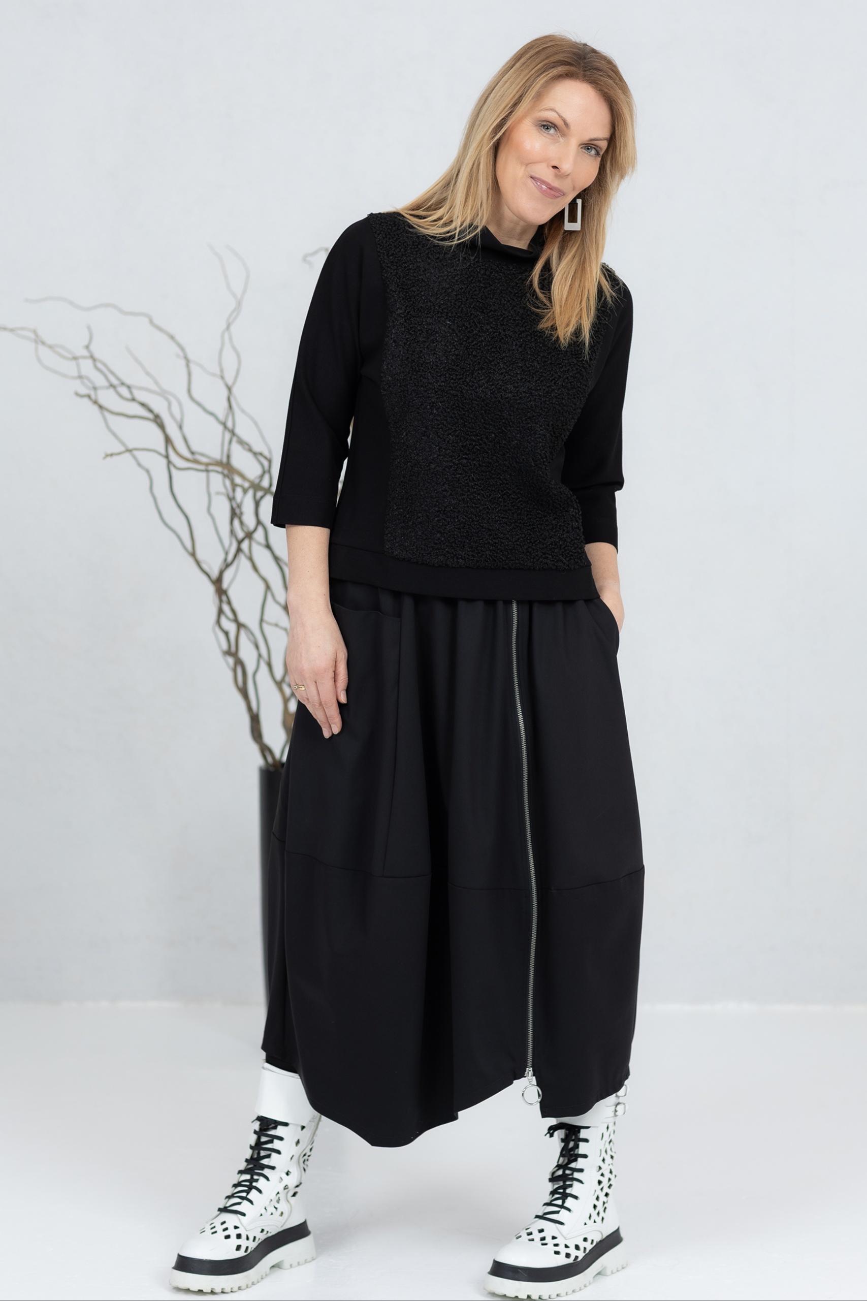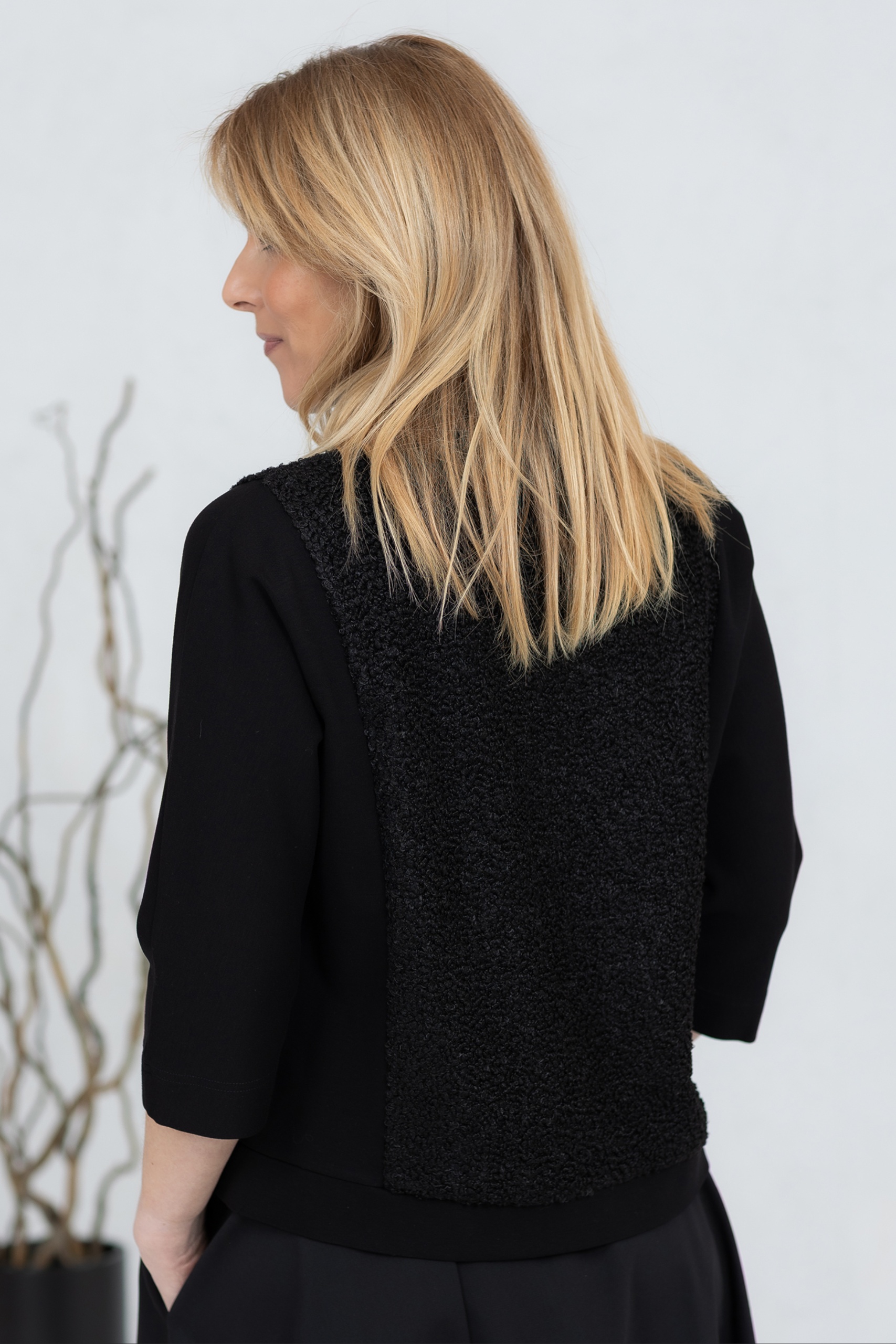 Musta pusero, jossa on kolme neljäsosaa pitkät hihat ja jonka etu- ja takapuoli on valmistettu pehmeästä teddykankaasta. Klassinen leikkaus takaa mukavan istuvuuden ja mahdollistaa puseron käyttämisen yksinään tai kerrospukeutumisessa. Leveä pääntie lisää puseroon luonnetta ja mahdollistaa erilaisia tyylivaihtoehtoja. Hihat ja sivut on valmistettu joustavasta, paksummasta viskoosikankaasta, joka takaa hyvän liikkumavapauden.