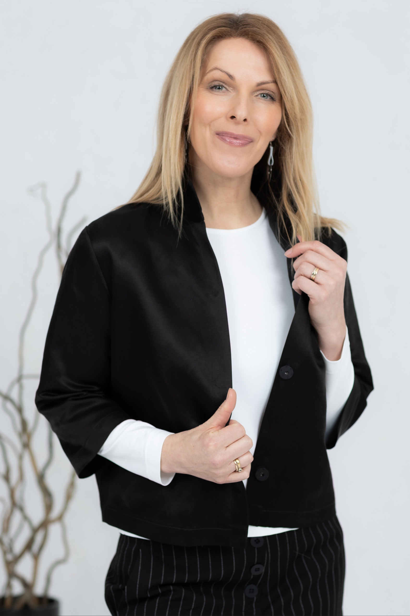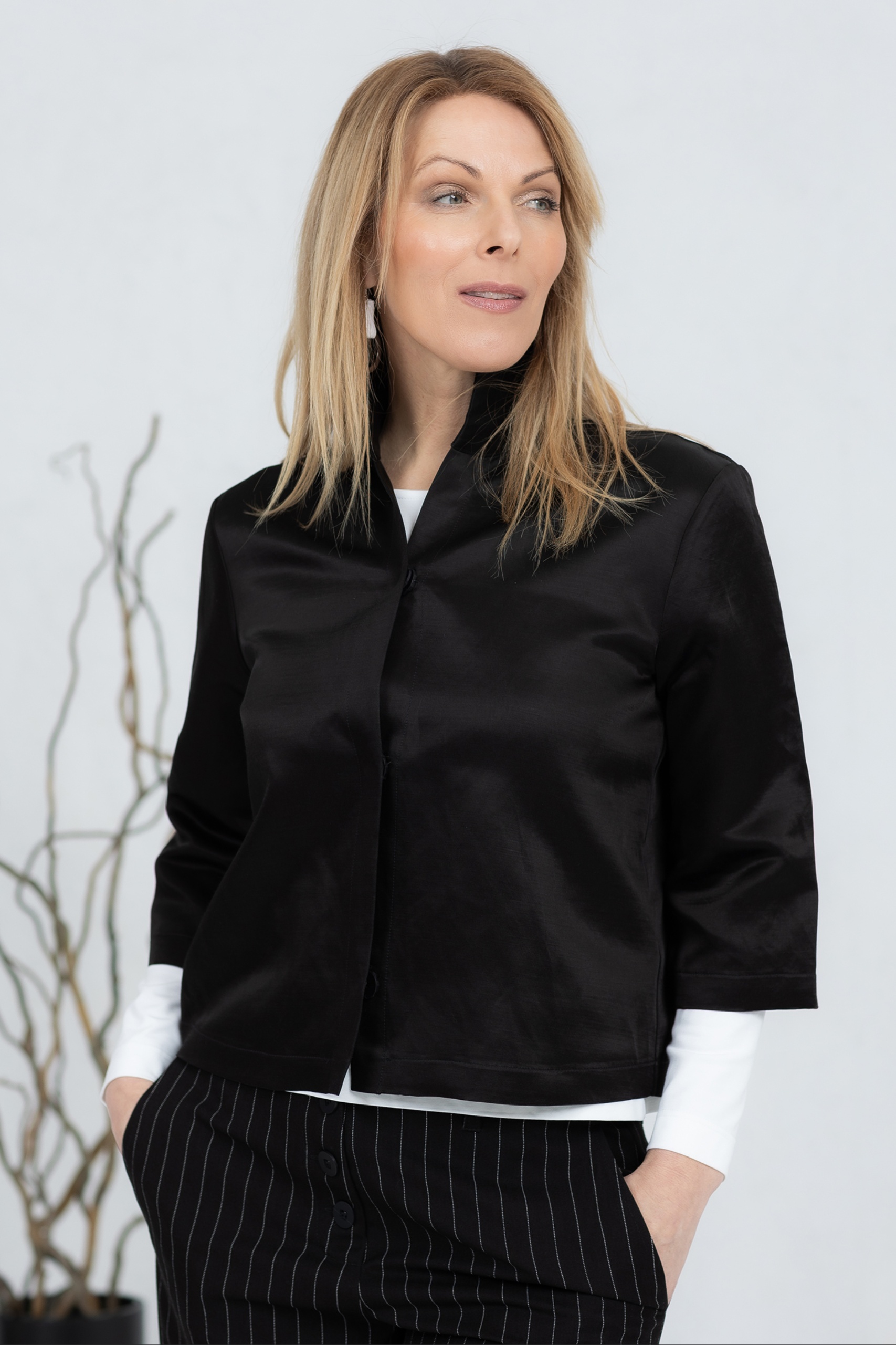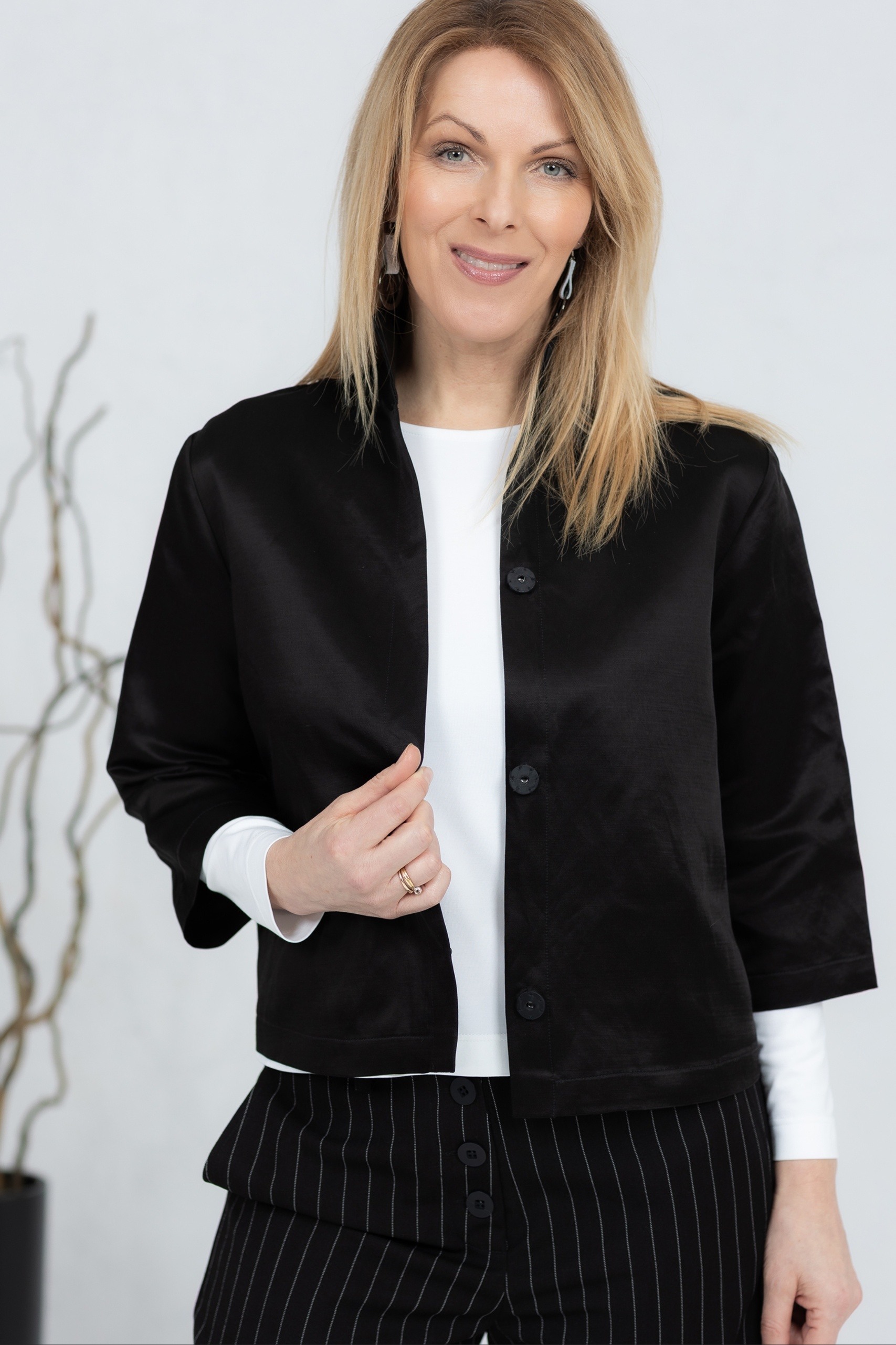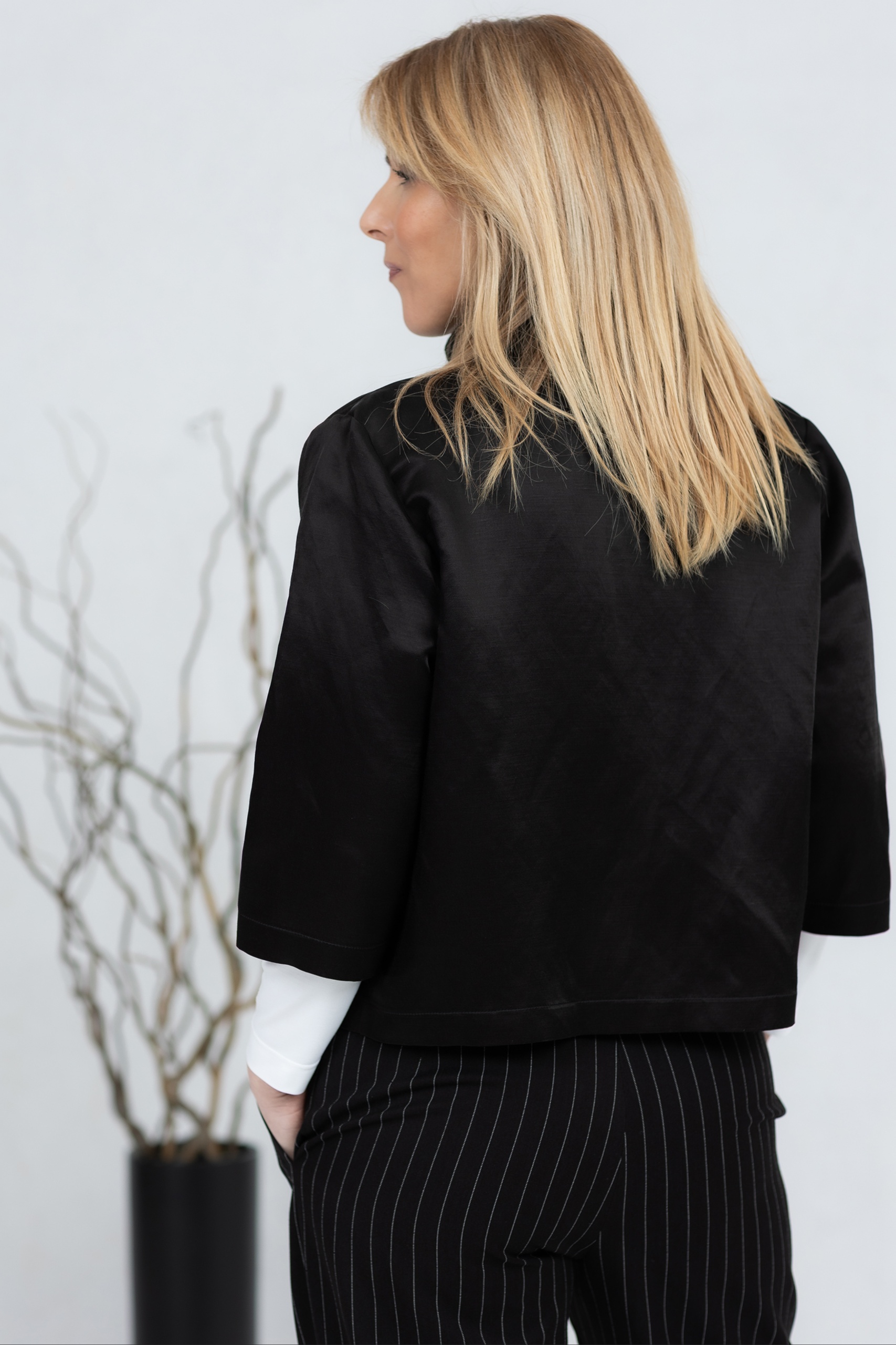 Yksinkertainen pieni musta takki erityistilaisuuksiin. Hieman kiiltävä musta kangas tekee tästä yksinkertaisesta takista välttämättömän lisäyksen vaatekaappiisi. 3/4-hihat ja napit edessä helpottavat yhdistämistä erilaisiin asuihin.
