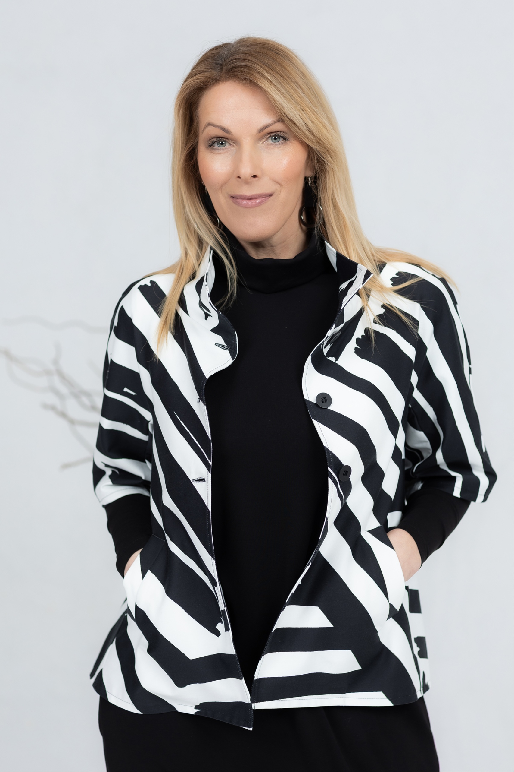 Yotaka-takki on mukava ja näyttävä lisäkerros, joka tuo luonnetta asuusi. Rohkea kuosi ja hieman väljä leikkaus luovat kauniin ja luonnollisen siluetin, joka on helppo yhdistää erilaisiin asuihin. Korkeampi kaulus ja napit antavat takille tyylikkään ilmeen, kun taas taskut lisäävät käytännöllisyyttä. Kangas pitää hyvin muotonsa, joten takki sopii erinomaisesti sekä arkeen että juhlaan.